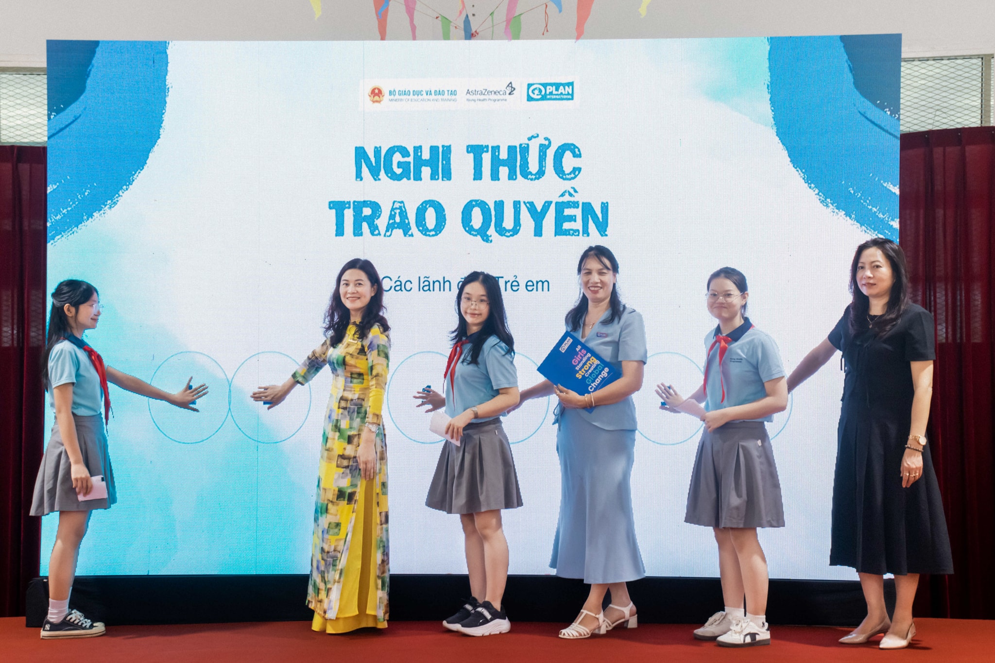 Nghi thức trao quyền cho các học sinh của các đại diện trường THCS Trương Công Giai, tổ chức Plan International Việt Nam và AstraZeneca (Ảnh: Plan International Việt Nam)