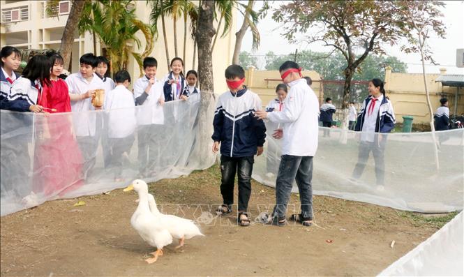 Học sinh trường THCS Châu Sơn, phường Châu Sơn tham gia trò chơi bịt mắt bắt vịt tại Ngày hội STEM - Hội chợ Xuân 2026.