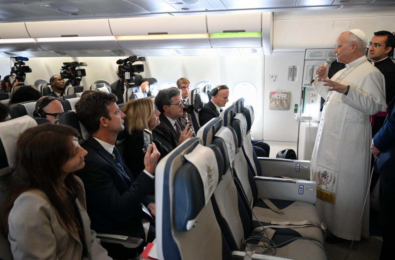 Giáo hoàng Leo XIV trả lời phỏng vấn báo chí trên chuyến bay trở về Vatican ngày 23-4. Ảnh: VATICAN NEWS