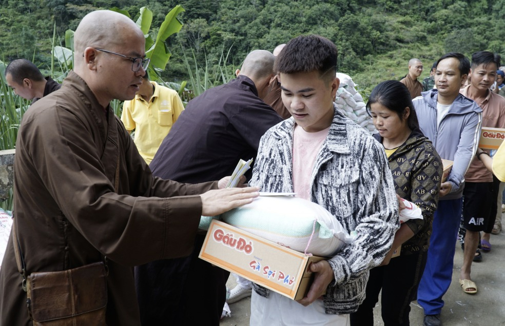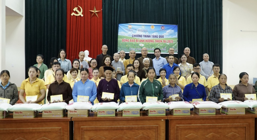 Giáo hội Phật giáo Việt Nam và các mạnh thường quân trao quà cho các hộ dân bị ảnh hưởng thiên tai tại xã Quang Trung.
