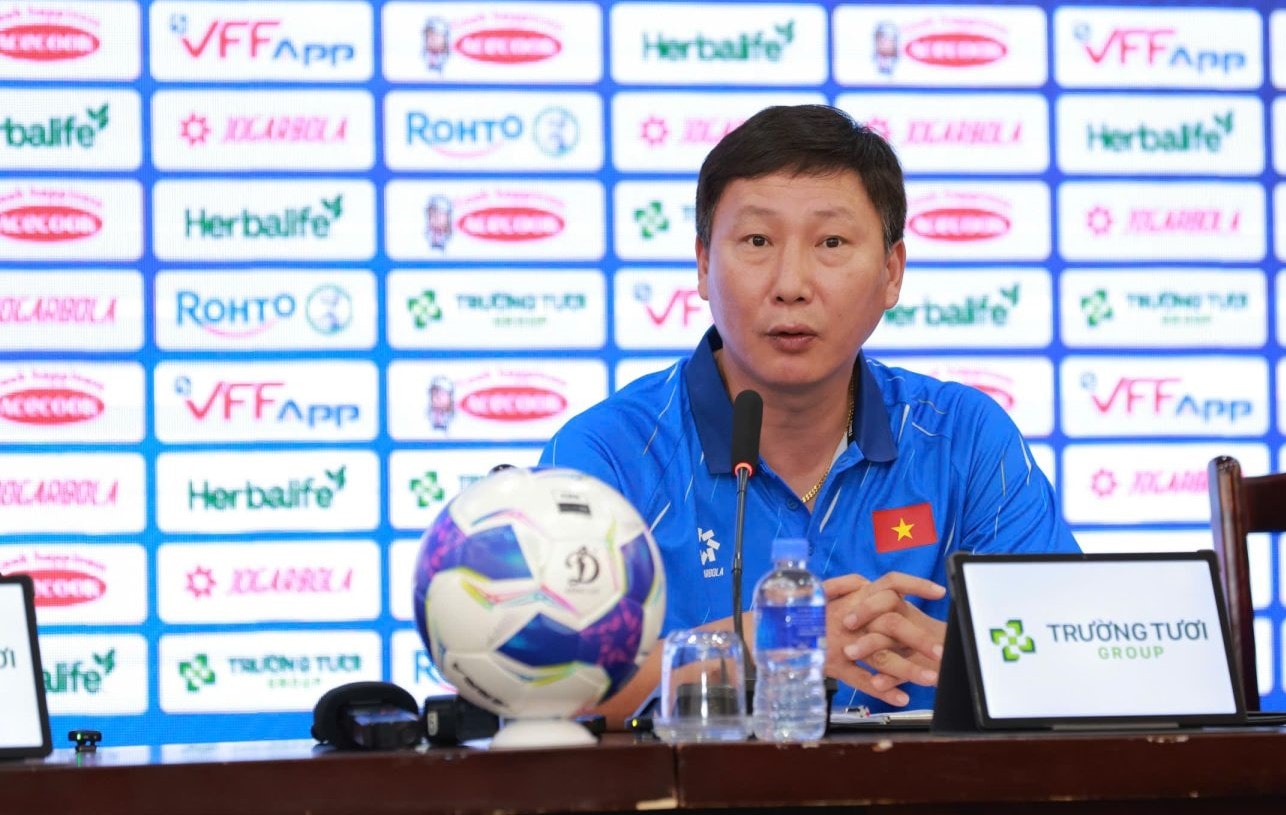 HLV Kim Sang-sik phát biểu tại họp báo. Ảnh: VFF