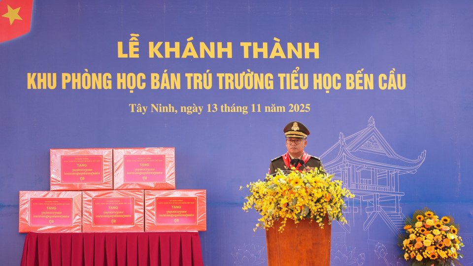 Đại tướng Tea Seiha, Phó Thủ tướng Chính phủ, Bộ trưởng Bộ Quốc phòng Vương quốc Campuchia phát biểu tại lễ khánh thành khu phòng học bán trú Trường Tiểu học Bến Cầu, tỉnh Tây Ninh. (Ảnh: Minh Phú/TTXVN)
