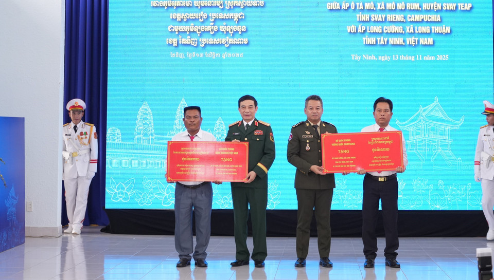 Đại tướng Phan Văn Giang, Bộ trưởng Bộ Quốc phòng và Đại tướng Tea Seiha, Phó Thủ tướng Chính phủ, Bộ trưởng Bộ Quốc phòng Vương quốc Campuchia tặng quà cho Cụm dân cư hai bên biên giới. (Ảnh: Minh Phú/TTXVN)