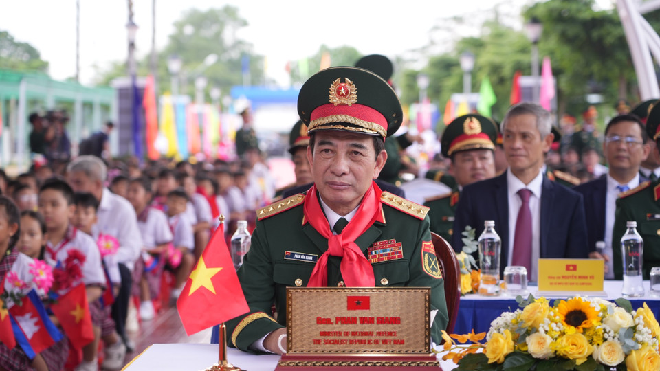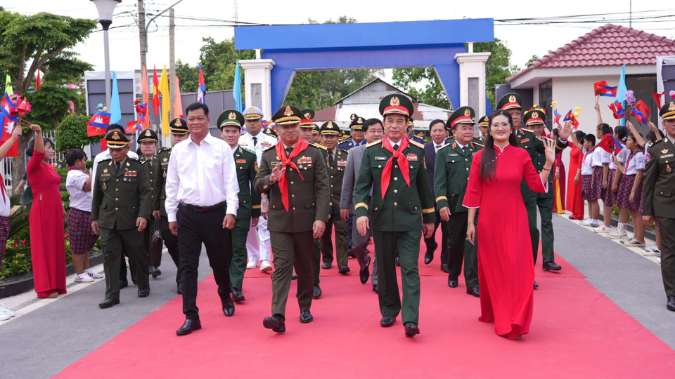 Đại tướng Phan Văn Giang, Bộ trưởng Bộ Quốc phòng và Đại tướng Tea Seiha, Phó Thủ tướng Chính phủ, Bộ trưởng Bộ Quốc phòng Vương quốc Campuchia tại Trường Tiểu học Bến Cầu, tỉnh Tây Ninh. (Ảnh: Minh Phú/TTXVN)