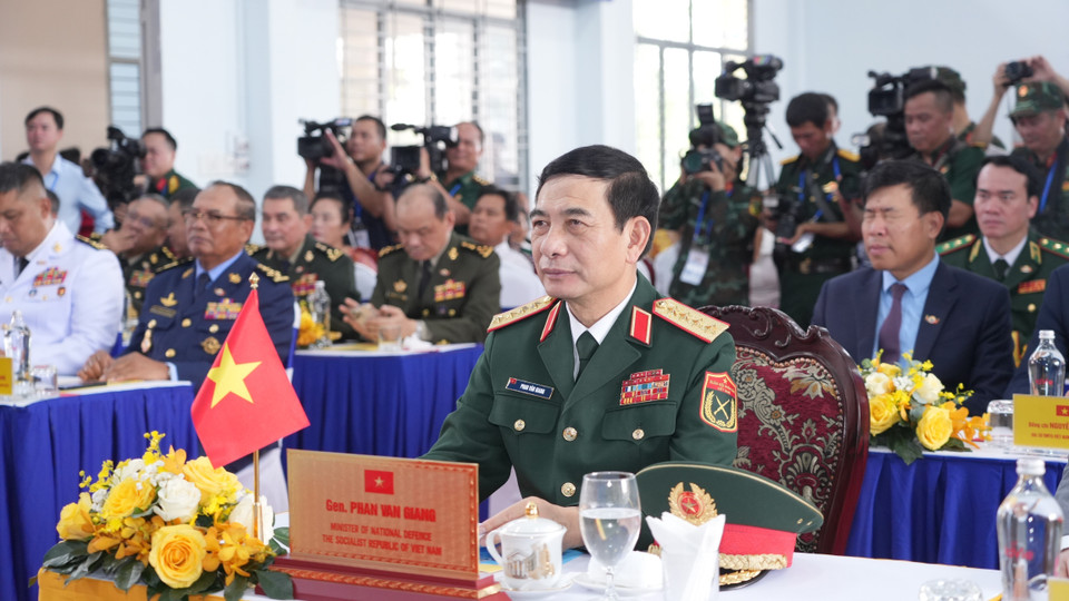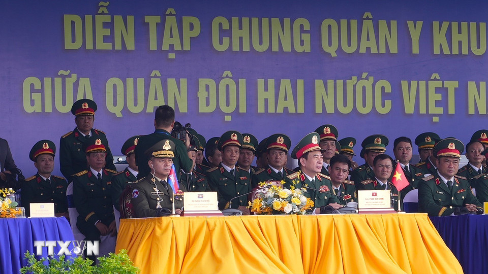 Đại tướng Phan Văn Giang, Bộ trưởng Bộ Quốc phòng và Đại tướng Tea Seiha, Phó Thủ tướng Chính phủ, Bộ trưởng Bộ Quốc phòng Vương quốc Campuchia dự diễn tập Quân y chung của Quân đội 2 nước. (Ảnh: Minh Phú/TTXVN)