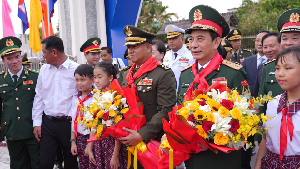 Học sinh Trường Tiểu học Bến Cầu, tỉnh Tây Ninh tặng hoa chào mừng Đại tướng Phan Văn Giang, Bộ trưởng Bộ Quốc phòng và Đại tướng Tea Seiha, Phó Thủ tướng Chính phủ, Bộ trưởng Bộ Quốc phòng Vương quốc Campuchia. (Ảnh: Minh Phú/TTXVN)