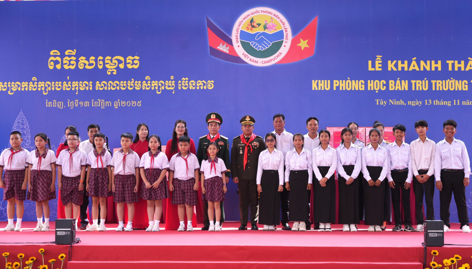 Đại tướng Phan Văn Giang, Bộ trưởng Bộ Quốc phòng và Đại tướng Tea Seiha, Phó Thủ tướng Chính phủ, Bộ trưởng Bộ Quốc phòng Vương quốc Campuchia tặng quà trường Tiểu học Bến Cầu. (Ảnh: Minh Phú/TTXVN)