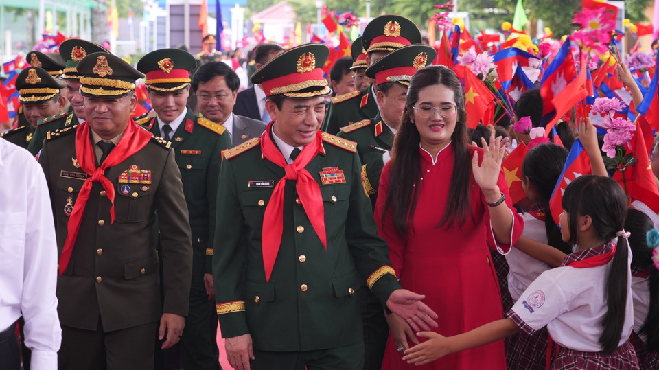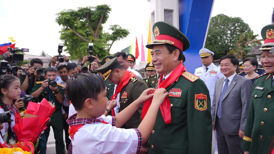 Học sinh Trường Tiểu học Bến Cầu, tỉnh Tây Ninh, đeo khăn quàng đỏ cho Đại tướng Phan Văn Giang, Bộ trưởng Bộ Quốc phòng và Đại tướng Tea Seiha, Phó Thủ tướng Chính phủ, Bộ trưởng Bộ Quốc phòng Vương quốc Campuchia. (Ảnh: Minh Phú/TTXVN)