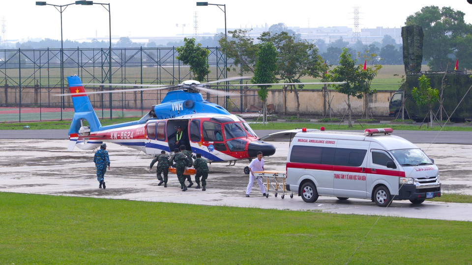 Giả định tình huống chuyển bệnh nhân bằng máy bay trực thăng tại Diễn tập Quân y chung của Quân đội 2 nước Việt Nam – Campuchia. (Ảnh: Minh Phú/TTXVN)