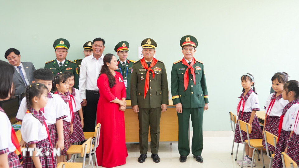 Đại tướng Phan Văn Giang, Bộ trưởng Bộ Quốc phòng và Đại tướng Tea Seiha, Phó Thủ tướng Chính phủ, Bộ trưởng Bộ Quốc phòng Vương quốc Campuchia đến thăm Trường Tiểu học Bến Cầu, tỉnh Tây Ninh. (Ảnh: Minh Phú/TTXVN)