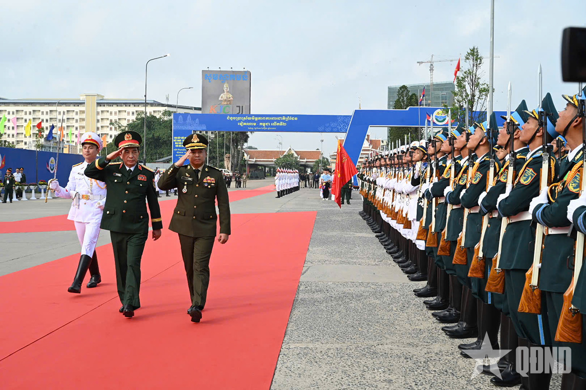 Đại tướng Phan Văn Giang và Đại tướng Tea Seiha duyệt Đội danh dự Quân đội nhân dân Việt Nam.