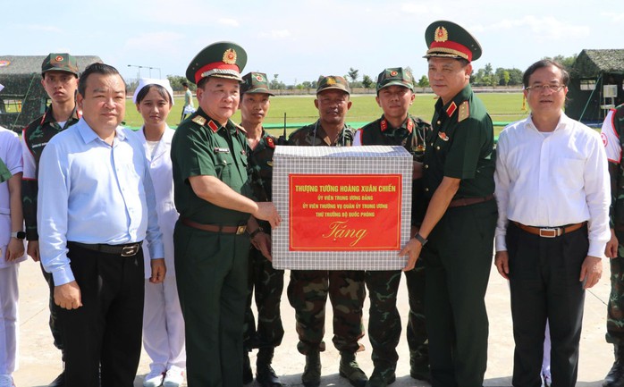 Lãnh đạo Bộ Quốc phòng và tỉnh Tây Ninh tặng quà động viên lực lượng 2 nước tham gia diễn tập quân y chung. Ảnh: Thế Giang