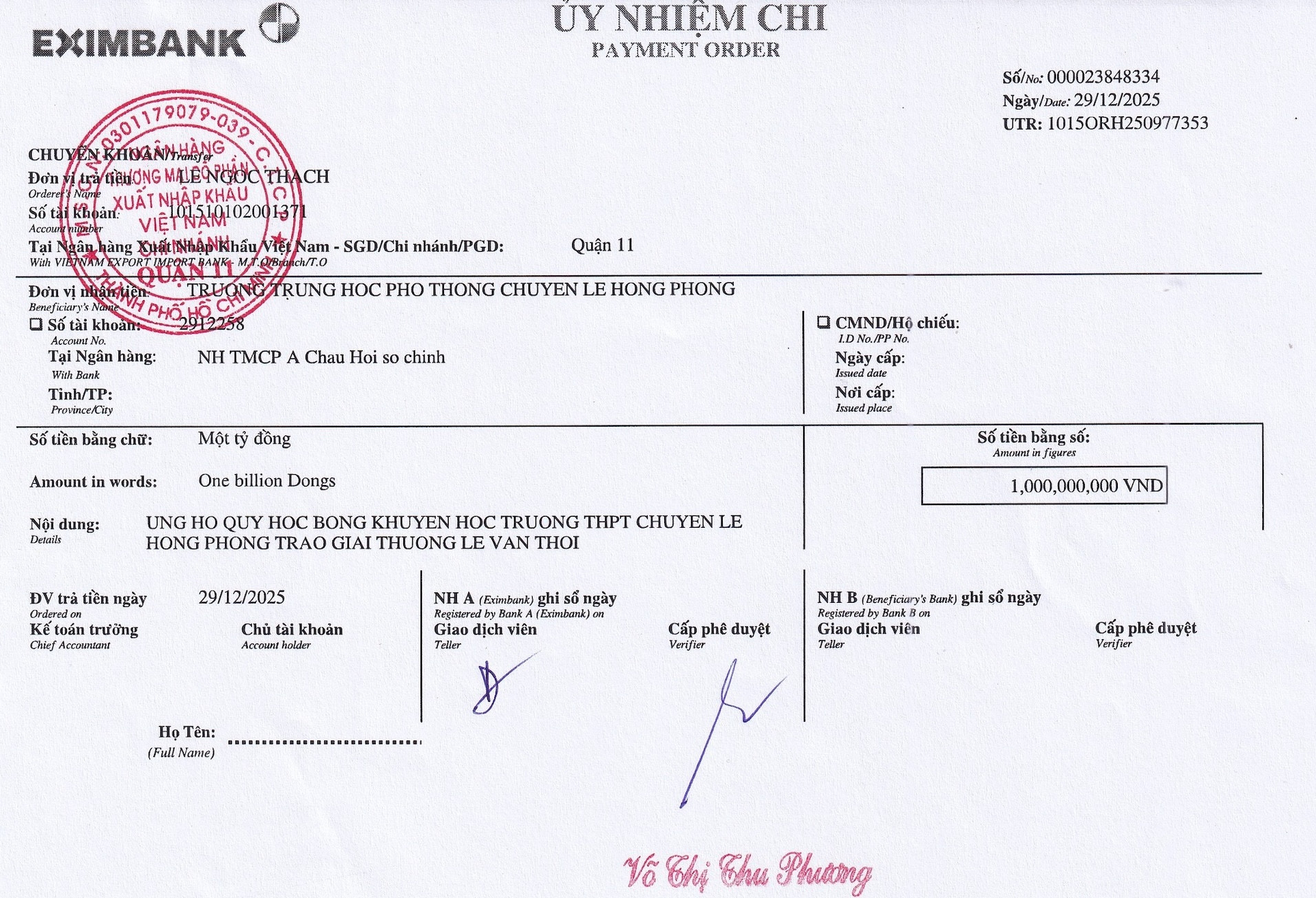 GS.TS Lê Ngọc Thạch, giảng viên thỉnh giảng Trường Đại học Khoa học Tự nhiên (Đại học Quốc gia TPHCM), cho biết ông vừa đến ngân hàng rút khoản tiết kiệm 1 tỷ đồng để chuyển tặng Trường THPT Chuyên Lê Hồng Phong. Số tiền này được dùng làm quỹ trao Giải thưởng Lê Văn Thới dành cho học sinh xuất sắc của trường.
