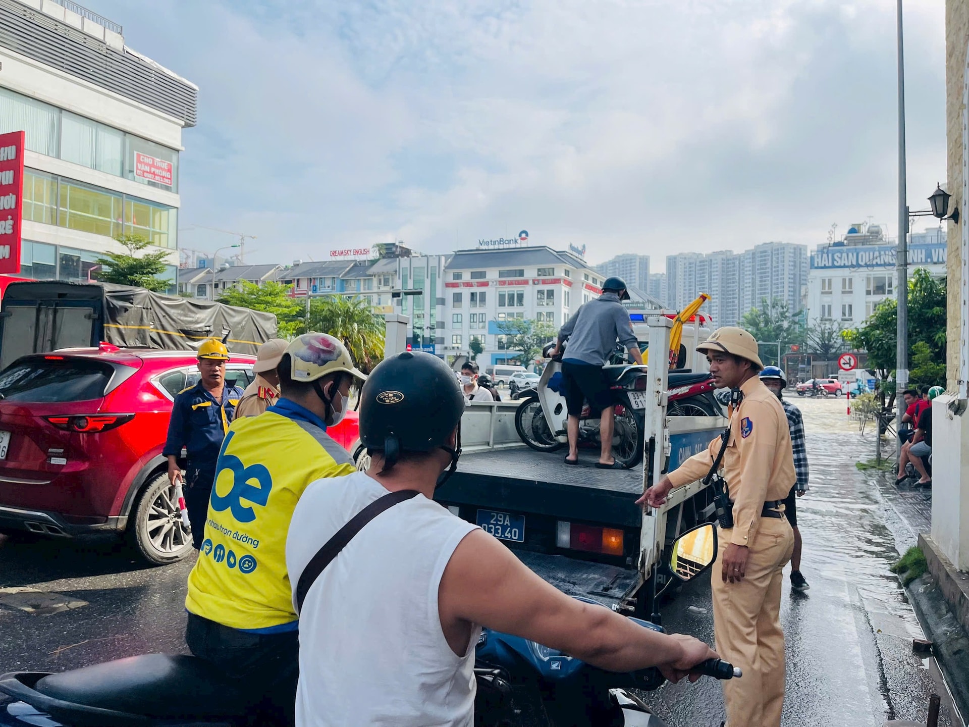 Tại các điểm ngập này, lực lượng Cảnh sát Giao thông Hà Nội đã được tăng cường túc trực để phân luồng giao thông từ xa; hướng dẫn phương tiện di chuyển an toàn; hỗ trợ người dân bị chết máy hoặc gặp sự cố.