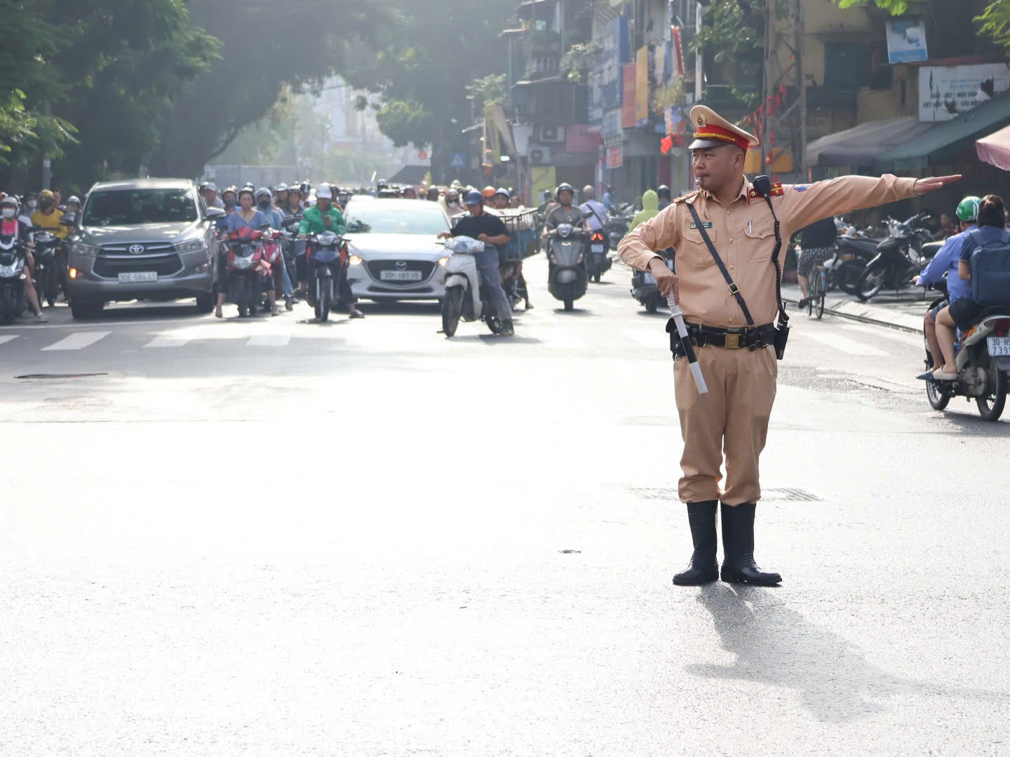 Lực lượng Cảnh sát giao thông điều tiết tại khu vực nút giao Tôn Đức Thắng - Cát Linh. Ảnh: MH