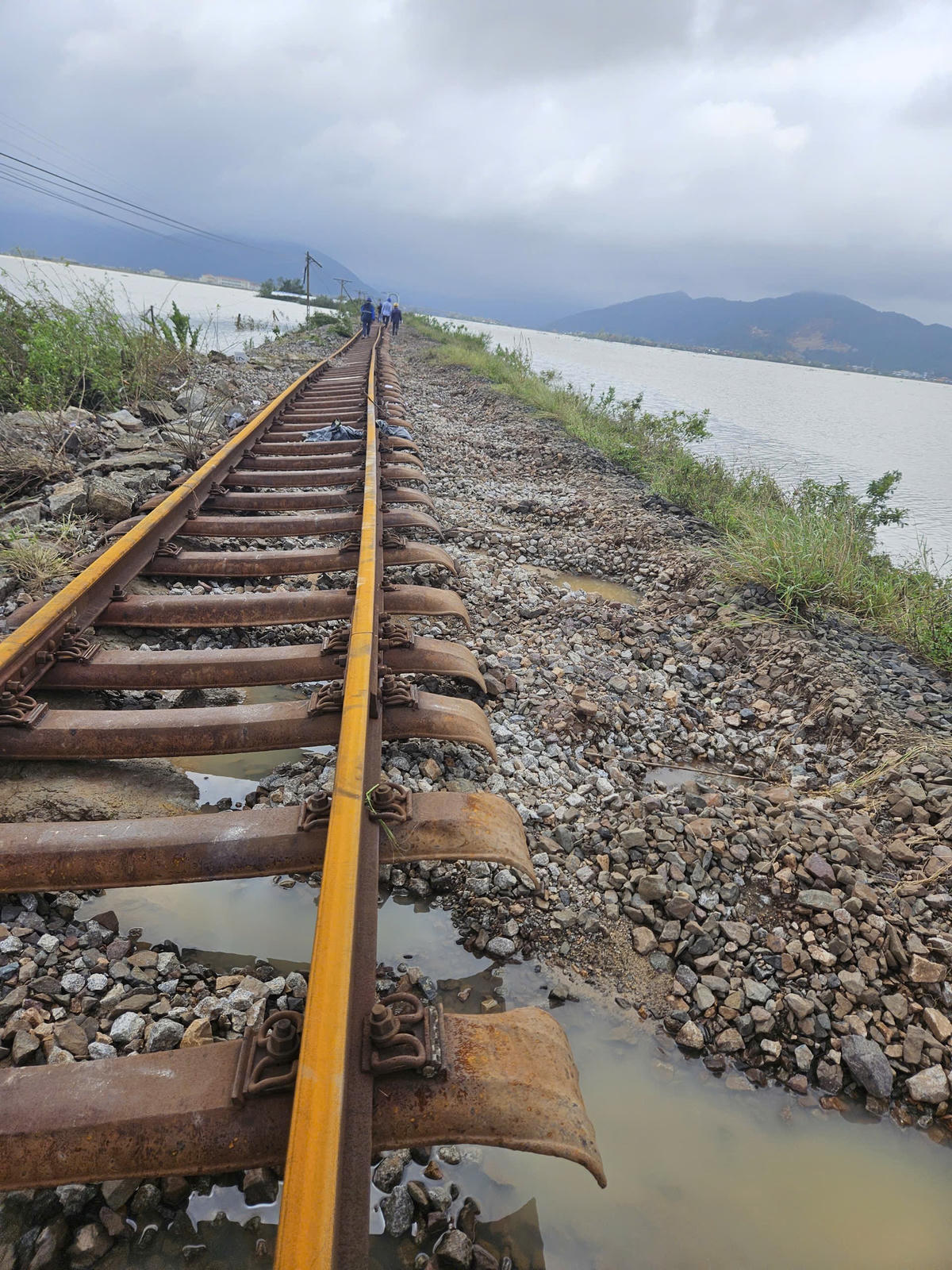 Trong lĩnh vực đường sắt, mưa lũ gây thiệt hại rất nặng nề với tổng cộng 61 điểm bị sạt lở, trôi nền đường; trong đó 46 điểm đã được khắc phục, còn 15 điểm vẫn đang được xử lý tại khu vực Đông Tác – Phú Hiệp và Phú Hiệp – Hảo Sơn. Một số đoạn bị trôi nền đường sâu 1–3 m, có nơi ray bị lệch tim tới 4 m; việc thi công gặp nhiều khó khăn do chỉ có thể tiếp cận bằng đường sắt. Theo dự kiến, đến 18 giờ ngày 27/11 có thể trả đường tốc độ 5 km/h tại khu vực nặng nhất. Trong khi đó, nhiều đoạn trên tuyến Diêu Trì – Quy Nhơn và tuyến Hà Nội – TP.HCM cũng ghi nhận tình trạng nền đá bị trôi, rác và cây cỏ tràn vào đường ray. Ngành đường sắt đã phải dừng chạy 44 đoàn tàu, hoàn trả hơn 21.000 vé và phục vụ miễn phí hơn 15.500 suất ăn cho hành khách bị mắc kẹt. Hiện chỉ còn năm đoàn tàu phải dừng tại Diêu Trì và Tháp Chàm.