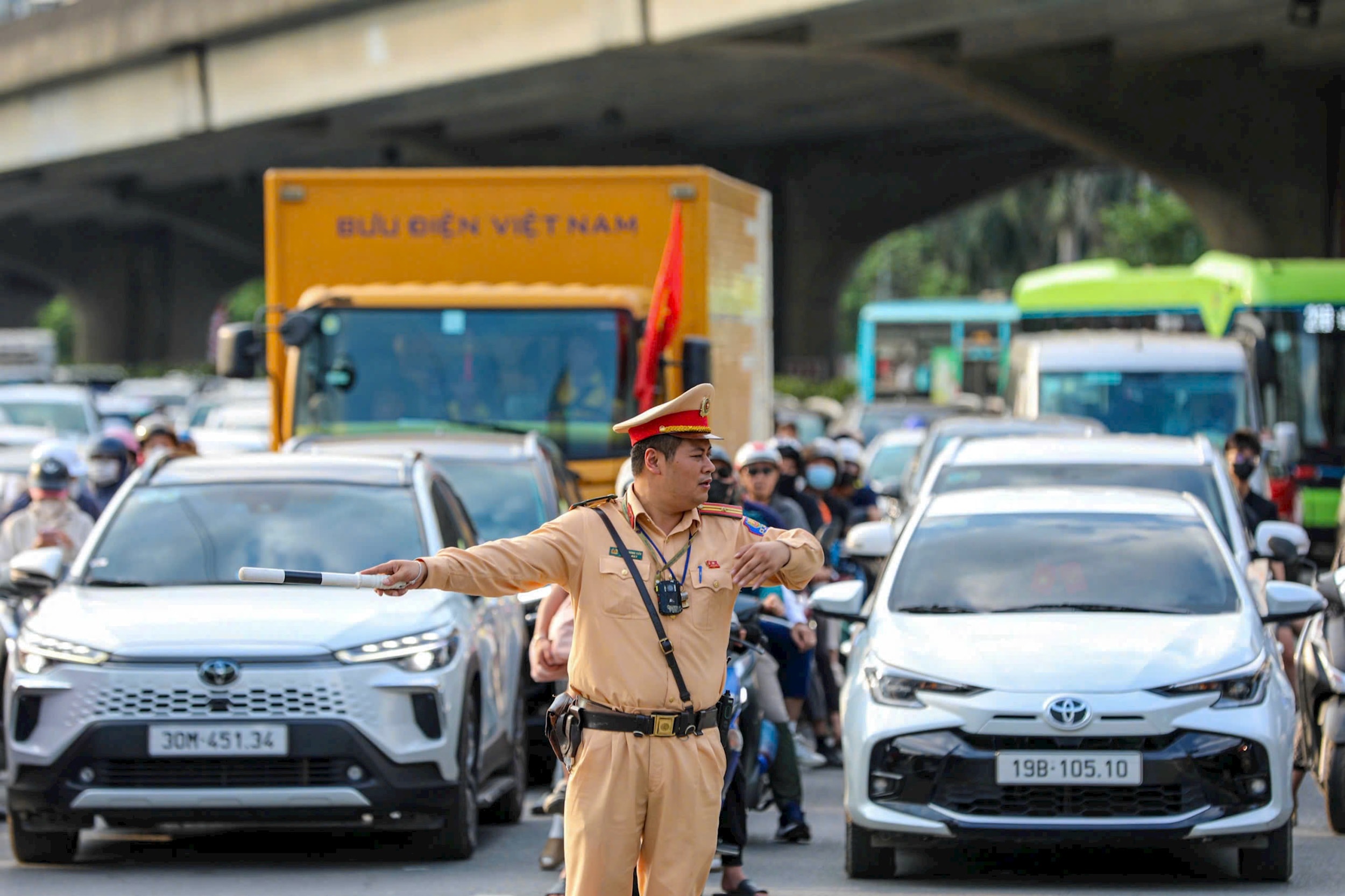 Ngay từ sáng sớm ngày 30-4, Phòng CSGT Hà Nội đã chủ động triển khai các phương án bảo đảm trật tự, an toàn giao thông, bố trí lực lượng tại các tuyến, nút giao trọng điểm, cửa ngõ ra vào thành phố như Vành đai 3, Giải Phóng, Pháp Vân, khu vực các bến xe, nhà ga…