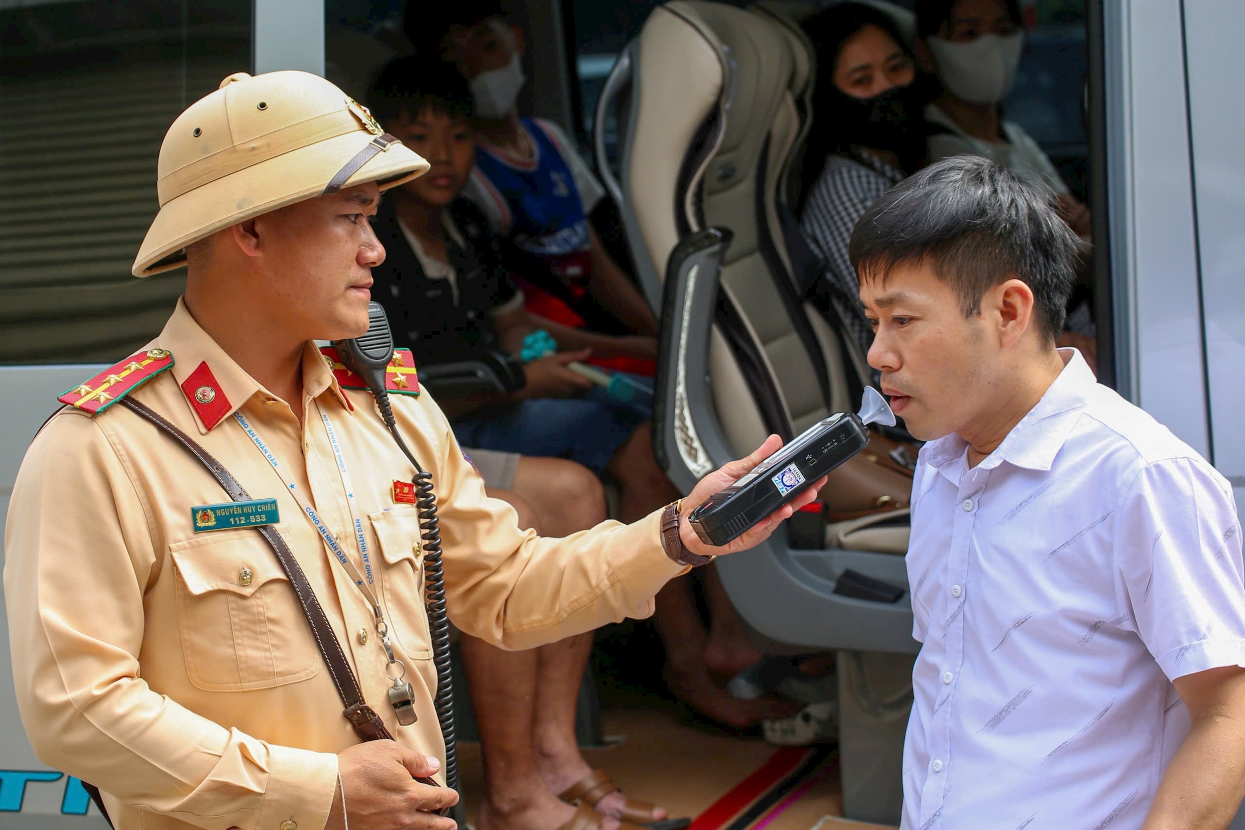 Lực lượng chức năng tiến hành kiểm tra nồng độ cồn đối với lái xe. Ảnh: Phạm Công