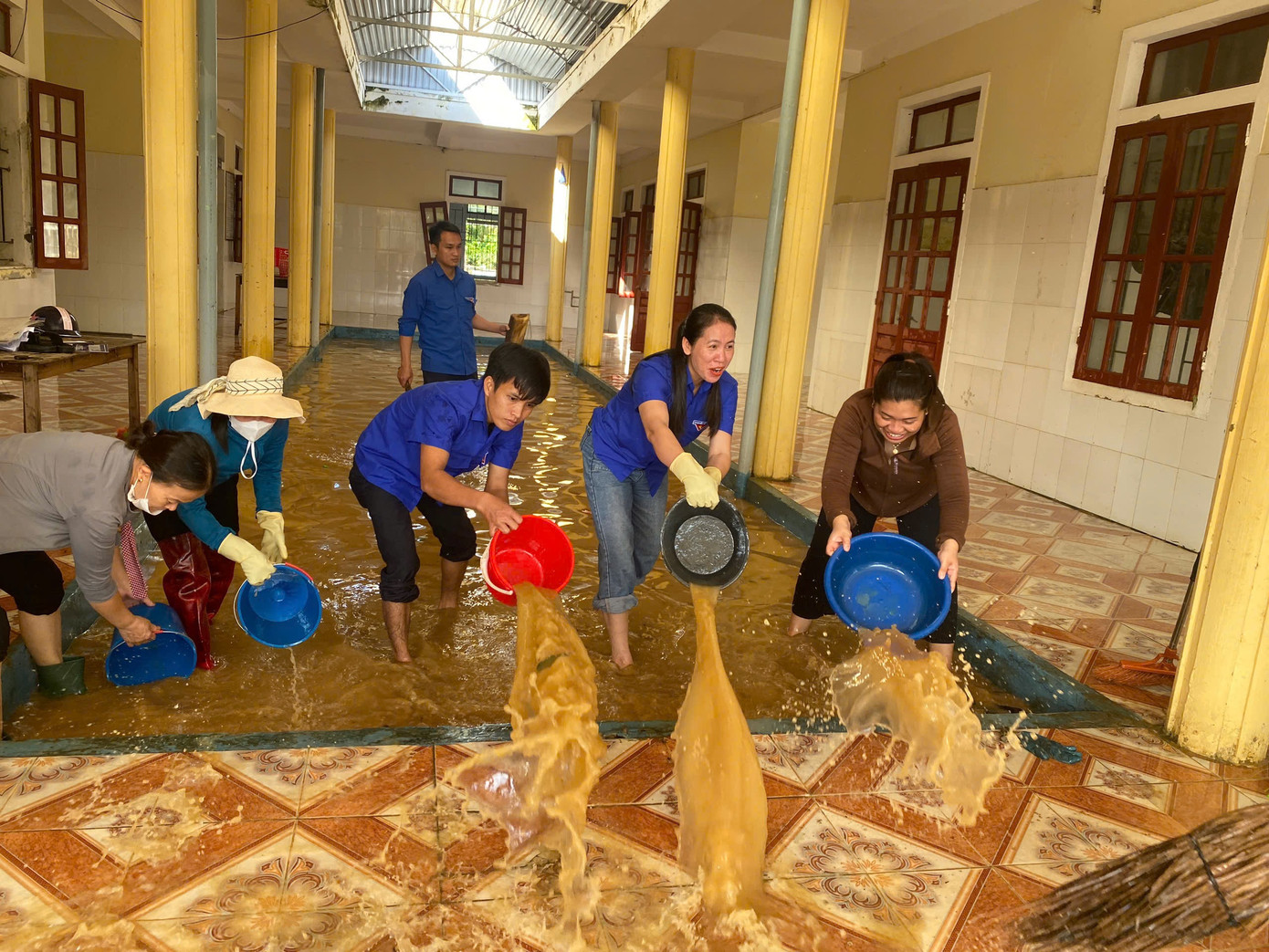 Tại trường Tiểu học Liên Minh (xã Đức Minh) khung cảnh ngổn ngang sau khi bão chồng lũ. Trong ngày 4/10, lực lượng dân quân tự vệ, đoàn viên thanh niên, công an xã Đức Minh phối hợp cùng các thầy cô giáo tiếp tục ra quân dọn vệ sinh, lau chùi trường lớp.