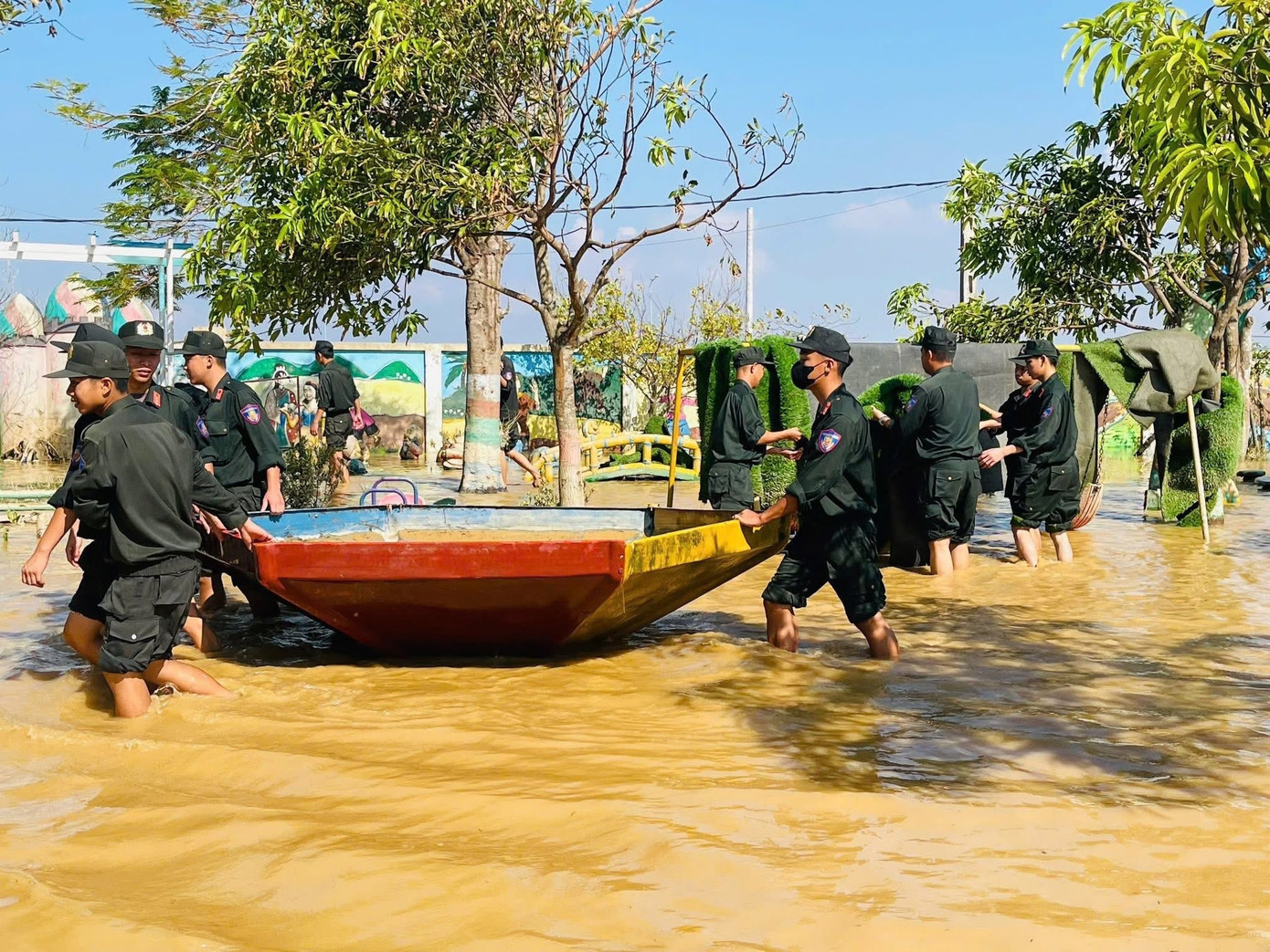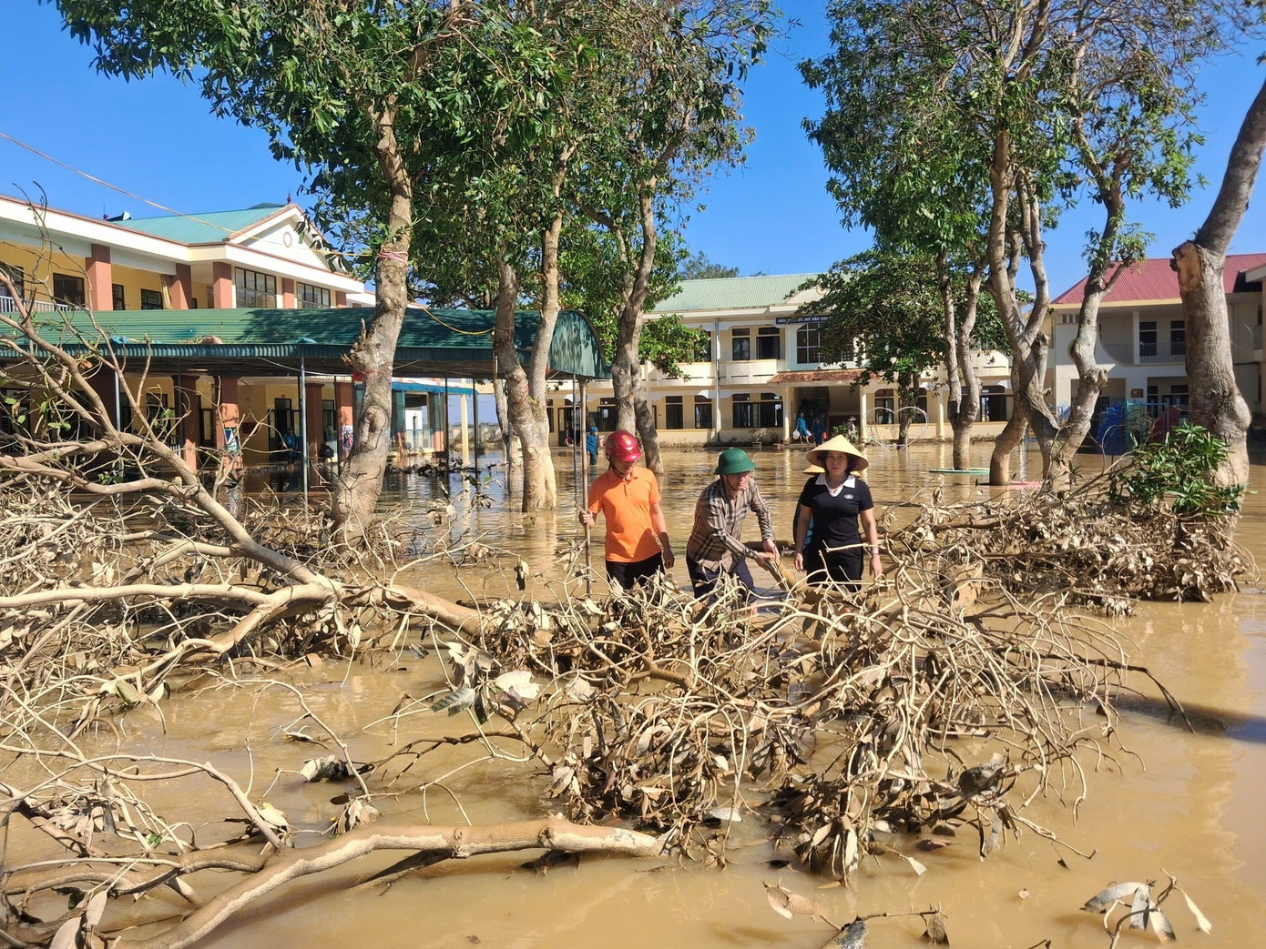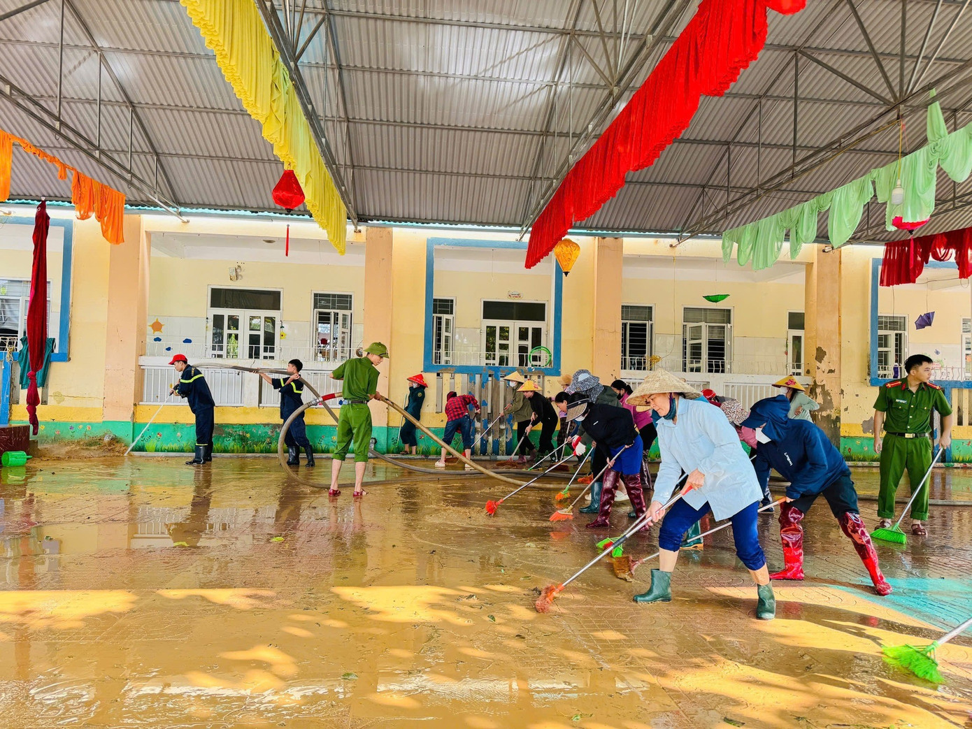 Các lực lượng thanh niên, công an, dân quân tự vệ cùng tham gia hỗ trợ khắc phục, dọn dẹp tại các điểm trường với hy vọng sớm đón học sinh trở lại trường sau mưa bão.