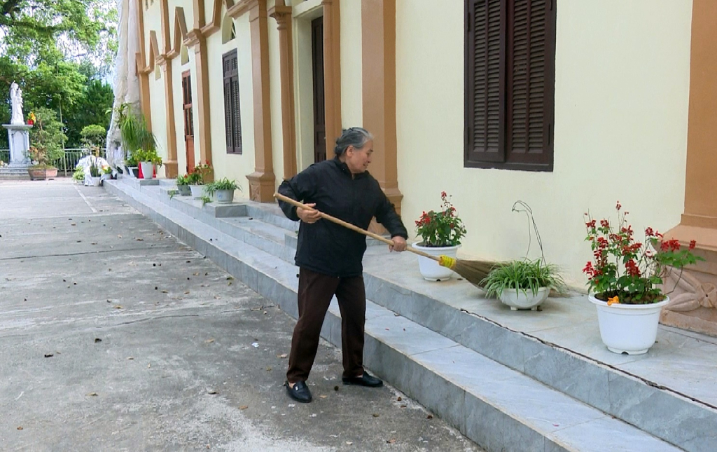 Giáo dân dọn dẹp khuôn viên Nhà thờ Thanh Sơn chuẩn bị đón lễ Giáng sinh.