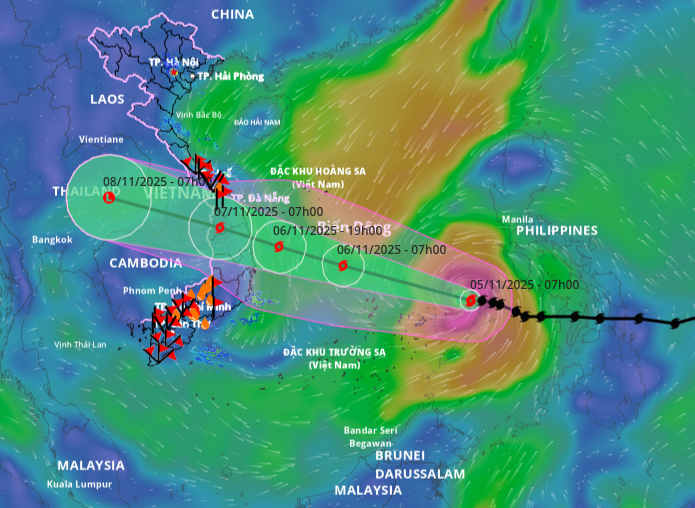 Dự báo chiều 6/11 bão đi vào khu vực vùng biển TP Đà Nẵng, Khánh Hòa. Đến đêm và rạng sáng 7/11, bão đi vào đất liền các tỉnh từ Quảng Ngãi – Đắk Lắk, sau đó di chuyển sang Lào, suy yếu thành áp thấp nhiệt đới và tan dần.