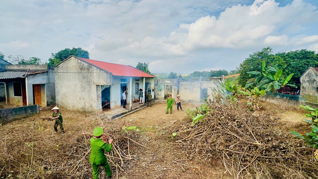 Lực lượng Công an xã Vân Du cùng chính quyền địa phương, các nhà hảo tâm hỗ trợ dọn dẹp, sắp xếp lại nhà cửa cho gia đình bà Lê Thị Thanh.