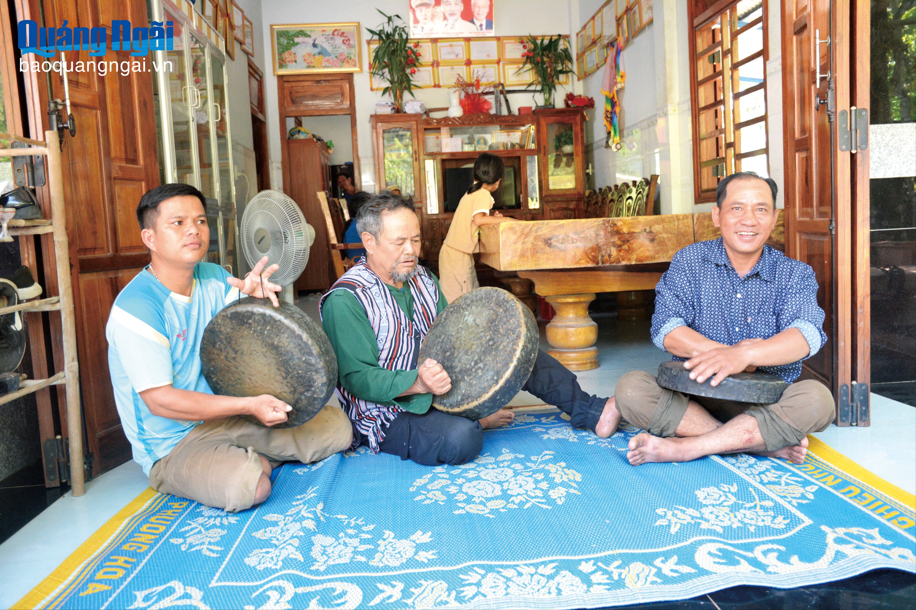 Anh Đinh Văn Rít, thôn Làng Giữa, xã Minh Long (bên trái) đánh chiêng Ba cùng các nghệ nhân lớn tuổi trong làng. Ảnh: K.NGÂN