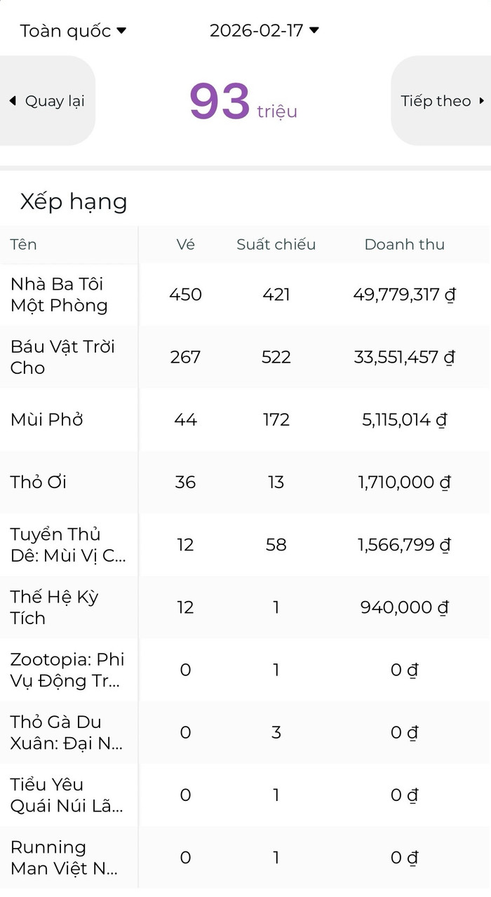 Thị trường điện ảnh Tết Nguyên đán 2026 đang chứng kiến những biến động nghẹt thở ngay từ giai đoạn mở bán vé sớm. Cách đây chưa đầy một ngày, cộng đồng mạng và giới chuyên môn không khỏi xôn xao trước thông tin dự án Thỏ Ơi!! của đạo diễn Trấn Thành có màn khởi đầu đầy bất ổn. Dựa trên số liệu ghi nhận vào ngày 10/2, bộ phim này chỉ thu về vỏn vẹn hơn 1,7 triệu đồng, xếp vị trí cuối cùng trong danh sách 4 phim Việt ra rạp mùa Tết. Ngược lại, Nhà Ba Tôi Một Phòng của Trường Giang tạm thời dẫn đầu, tạo nên một kịch bản "lép vế" đầy bất ngờ cho đạo diễn nghìn tỷ.