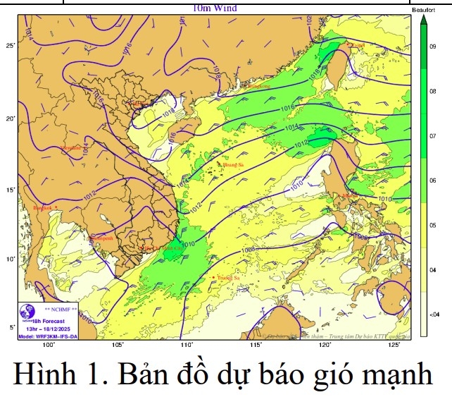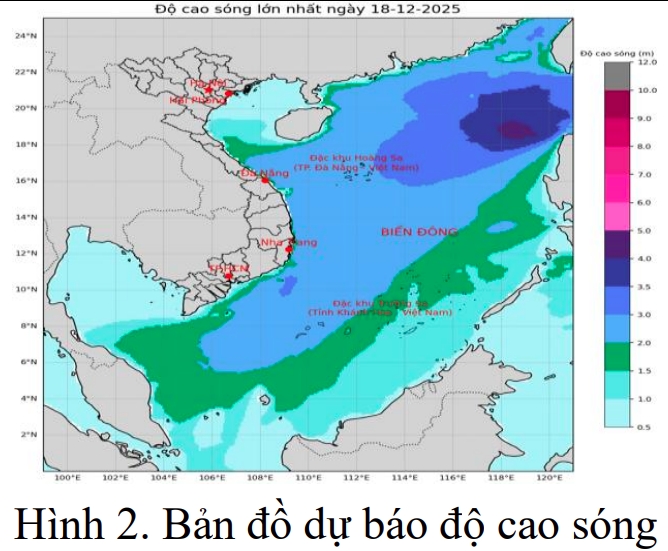 Trong 24 giờ tới, khu vực Bắc Biển Đông (bao gồm đặc khu Hoàng Sa) tiếp tục chịu ảnh hưởng của gió Đông Bắc mạnh cấp 6, riêng phía Đông Bắc có lúc mạnh cấp 7, giật cấp 8–9, biển động mạnh. Độ cao sóng phổ biến từ 3,0–5,0m. Dự báo đêm 18/12, gió có xu hướng giảm dần.