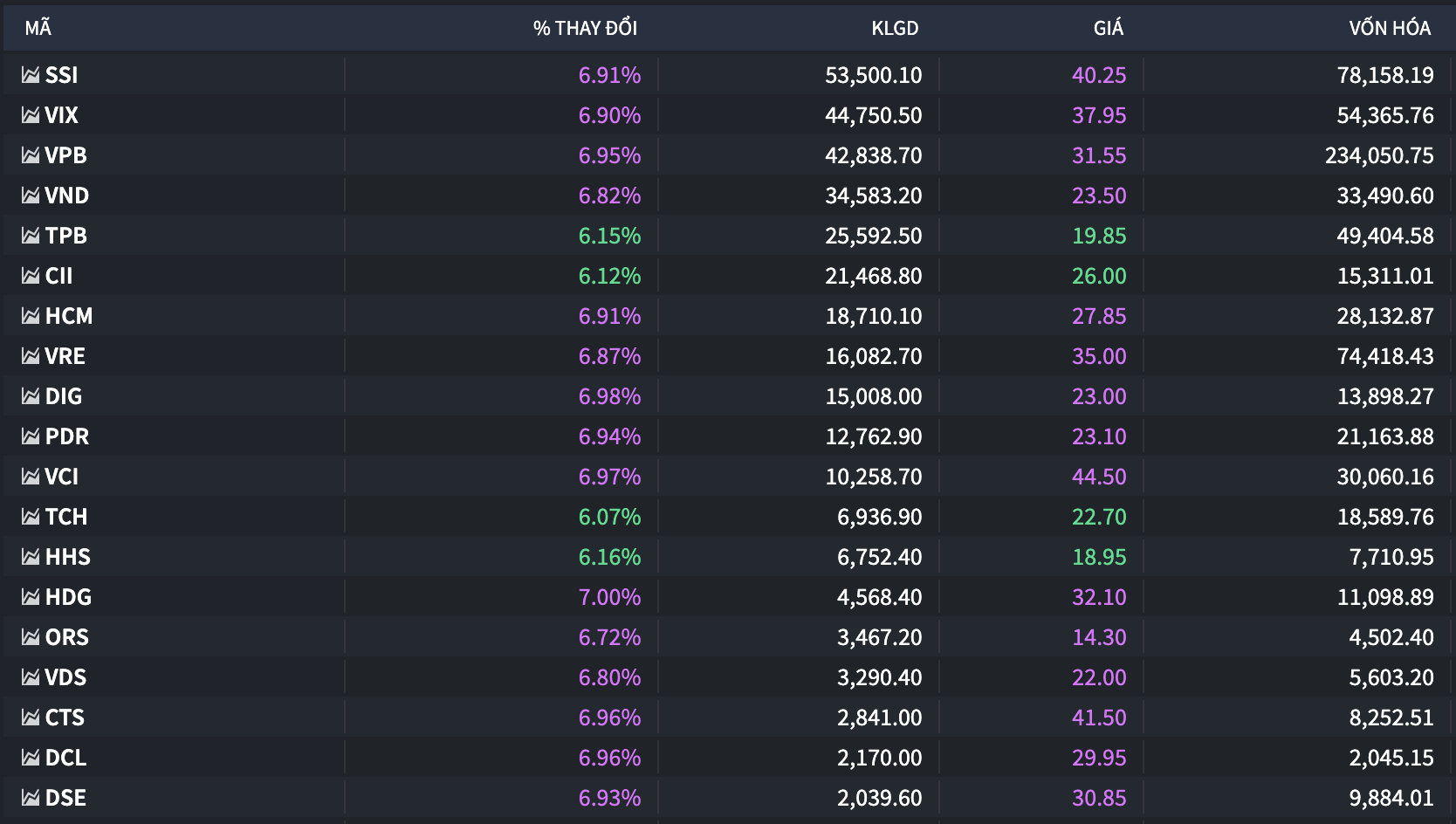 Có thể điểm đến VDS (+6,8%), HCM (+6,91%), VND (+6,82%), VIX (6,9%), VCI (6,97%), ORS (6,72%), CTS (6,96%), DSE (6,93%), … và đều nằm trong nhóm những cổ phiếu tăng mạnh nhất sàn HoSE hôm nay.