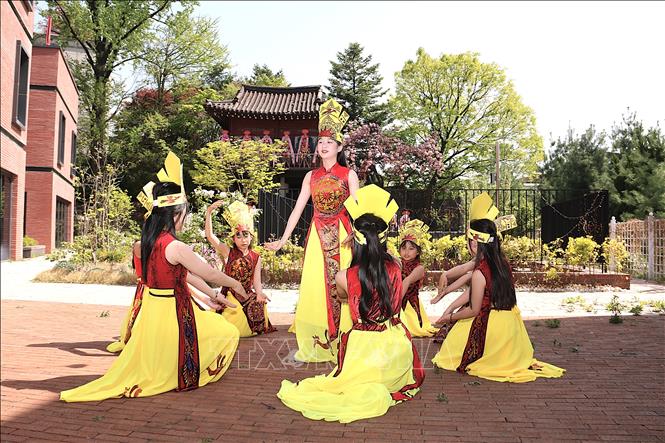 Các trẻ em gia đình đa văn hóa Việt - Hàn thể hiện điệu múa truyền thống. Ảnh: Khánh Vân/PV TTXVN tại Hàn Quốc