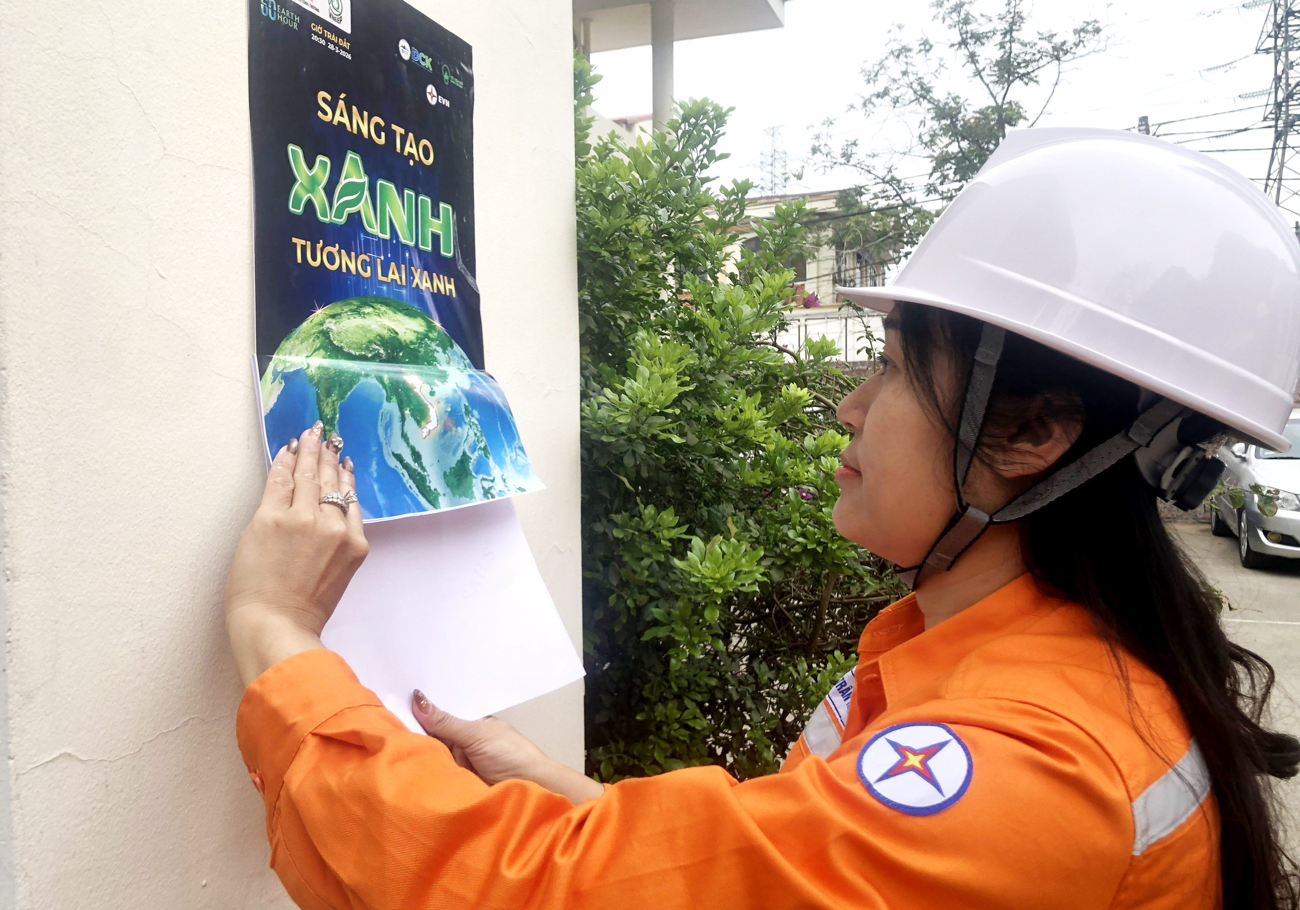 Nhân viên Điện lực khu vực xứ Lạng dán poster có thông điệp “Sáng tạo xanh – Tương lai xanh” tại các cơ quan trên địa bàn phường Tam Thanh