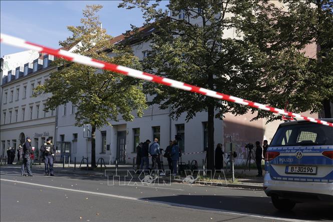 Cảnh sát gác phía trước giáo đường Do Thái tại thủ đô Berlin, Đức, sau vụ ném bom xăng, ngày 18/10/2023. Ảnh: AFP/TTXVN