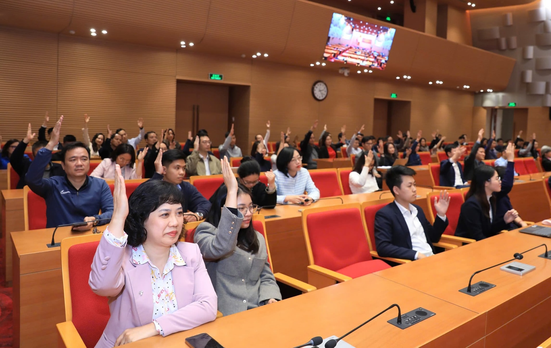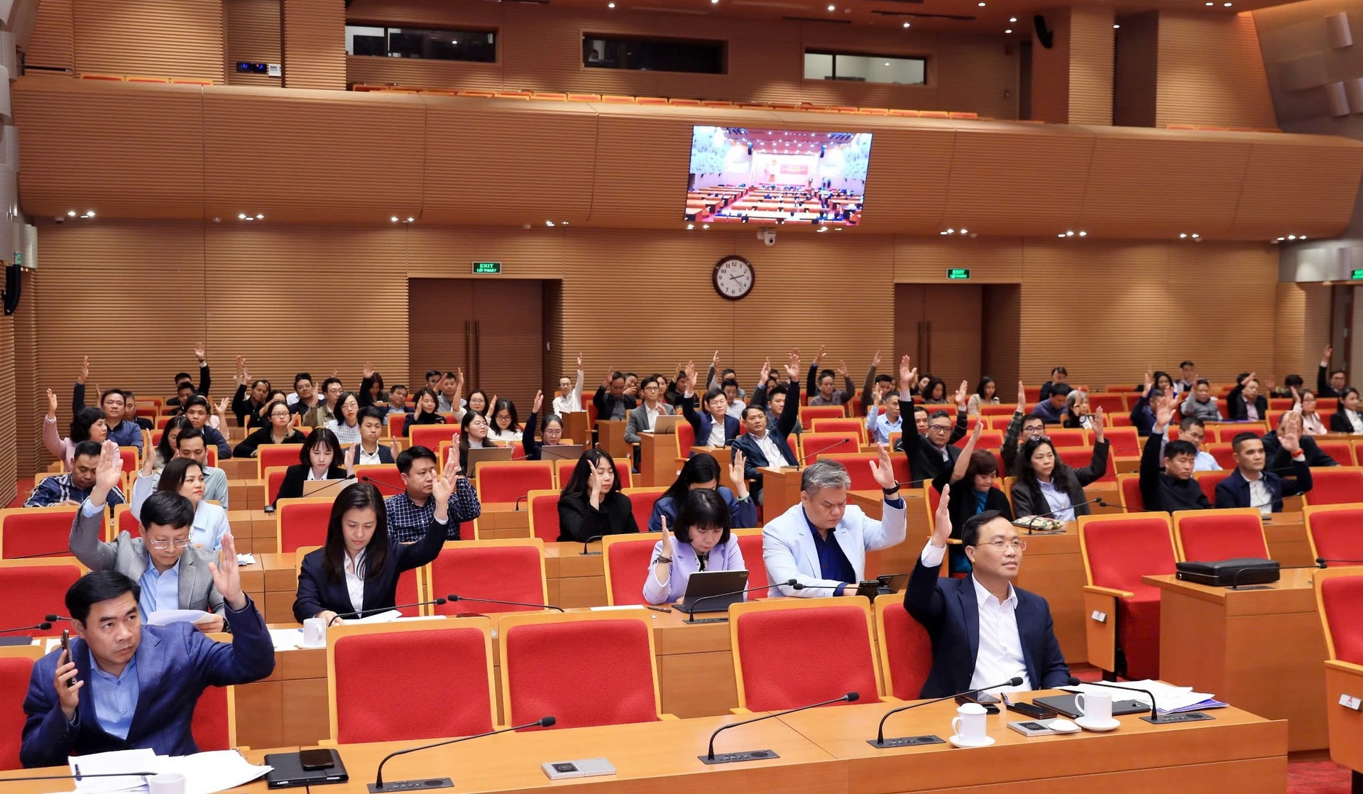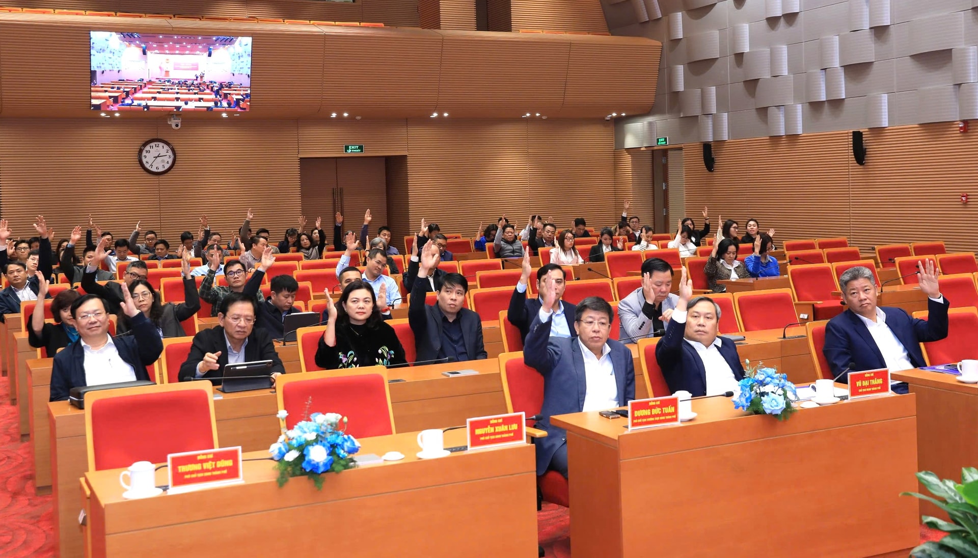 Cử tri biểu quyết nhất trí giới thiệu các đồng chí: Vũ Đại Thắng, Dương Đức Tuấn, Nguyễn Mạnh Quyền ứng cử đại biểu HĐND thành phố khóa XVII, nhiệm kỳ 2026-2031. Ảnh: Đình Hiệp
