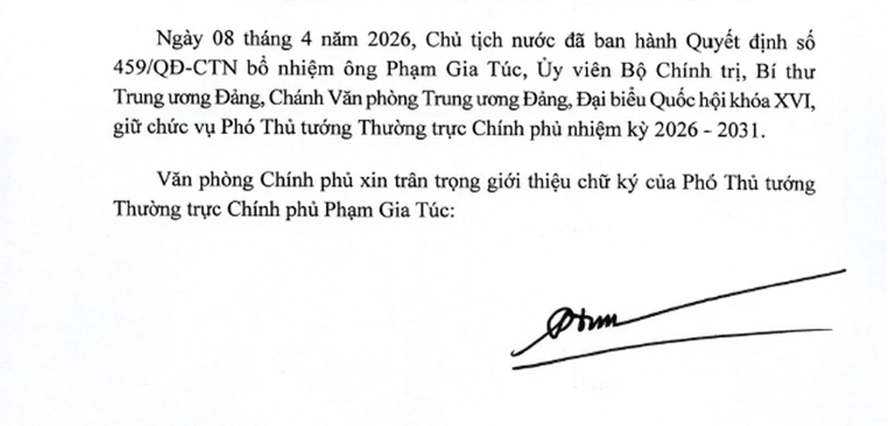 * Ngày 08/4/2026, Chủ tịch nước đã ban hành Quyết định số 459/QĐ-CTN bổ nhiệm đồng chí Phạm Gia Túc, Ủy viên Bộ Chính trị, Bí thư Trung ương Đảng, Chánh Văn phòng Trung ương Đảng, đại biểu Quốc hội khóa XVI, giữ chức vụ Phó Thủ tướng Thường trực Chính phủ nhiệm kỳ 2026-2031.