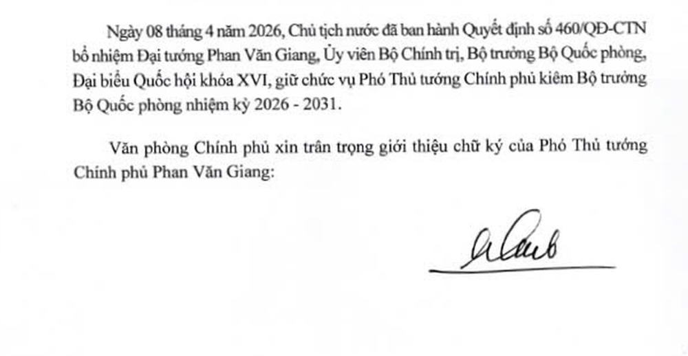 * Ngày 08/4/2026, Chủ tịch nước đã ban hành Quyết định số 460/QĐ-CTN bổ nhiệm Đại tướng Phan Văn Giang, Ủy viên Bộ Chính trị, Bộ trưởng Bộ Quốc phòng, đại biểu Quốc hội khóa XVI, giữ chức vụ Phó Thủ tướng Chính phủ kiêm Bộ trưởng Bộ Quốc phòng nhiệm kỳ 2026-2031.