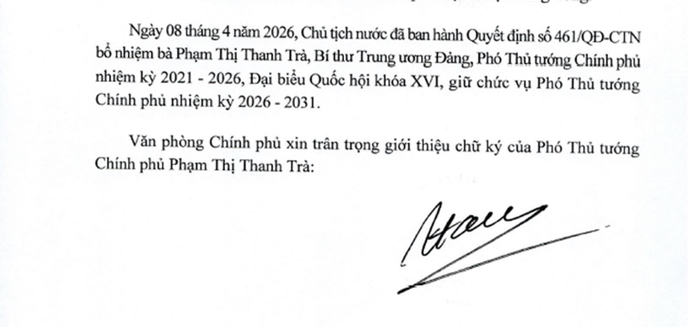 * Ngày 08/4/2026, Chủ tịch nước đã ban hành Quyết định số 461/QĐ-CTN bổ nhiệm đồng chí Phạm Thị Thanh Trà, Bí thư Trung ương Đảng, Phó Thủ tướng Chính phủ nhiệm kỳ 2021-2026, Đại biểu Quốc hội khóa XVI, giữ chức vụ Phó Thủ tướng Chính phủ nhiệm kỳ 2026-2031.