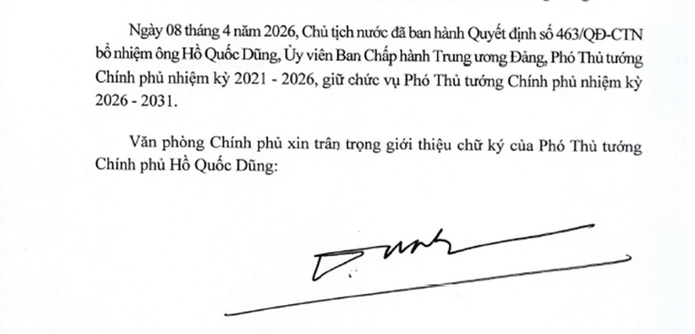 * Ngày 08/4/2026, Chủ tịch nước đã ban hành Quyết định số 463/QĐ-CTN bổ nhiệm đồng chí Hồ Quốc Dũng, Ủy viên Ban Chấp hành Trung ương Đảng, Phó Thủ tướng Chính phủ nhiệm kỳ 2021-2026, giữ chức vụ Phó Thủ tướng Chính phủ nhiệm kỳ 2026-2031.