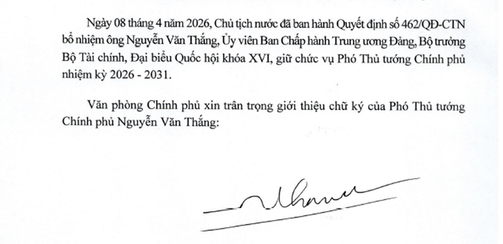 * Ngày 08/4/2026, Chủ tịch nước đã ban hành Quyết định số 462/QĐ-CTN bổ nhiệm đồng chí Nguyễn Văn Thắng, Ủy viên Ban Chấp hành Trung ương Đảng, Bộ trưởng Bộ Tài chính, đại biểu Quốc hội khóa XVI, giữ chức vụ Phó Thủ tướng Chính phủ nhiệm kỳ 2026-2031.