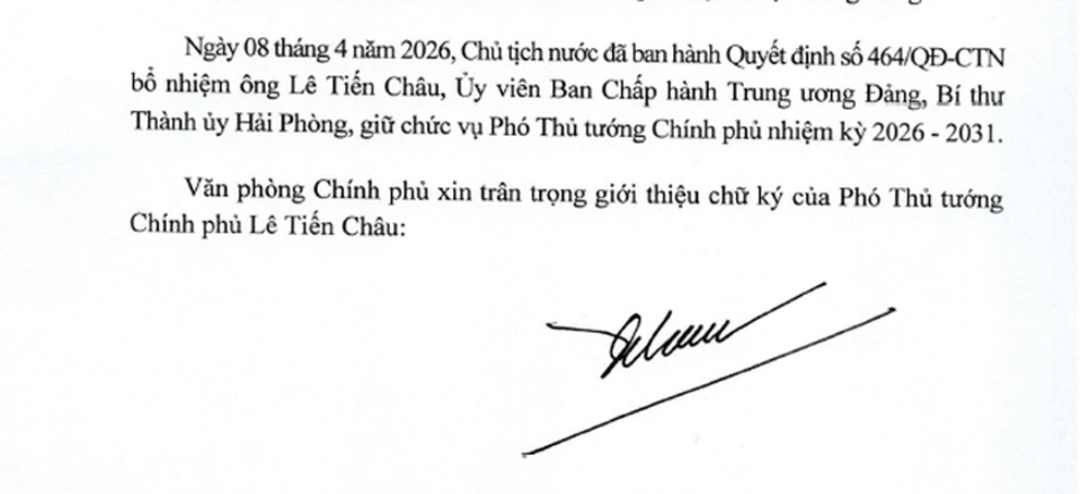* Ngày 08/4/2026, Chủ tịch nước đã ban hành Quyết định số 464/QĐ-CTN bổ nhiệm đồng chí Lê Tiến Châu, Ủy viên Ban Chấp hành Trung ương Đảng, Bí thư Thành ủy Hải Phòng, giữ chức vụ Phó Thủ tướng Chính phủ nhiệm kỳ 2026-2031.