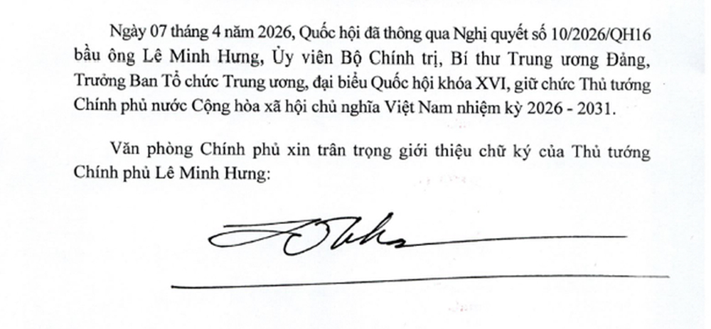 Trước đó, ngày 07/4/2026, Quốc hội đã thông qua Nghị quyết số 10/2026/QH16 bầu đồng chí Lê Minh Hưng, Ủy viên Bộ Chính trị, Bí thư Trung ương Đảng, Trưởng Ban Tổ chức Trung ương, đại biểu Quốc hội khóa XVI, giữ chức Thủ tướng Chính phủ nước Cộng hòa xã hội chủ nghĩa Việt Nam nhiệm kỳ 2026-2031.