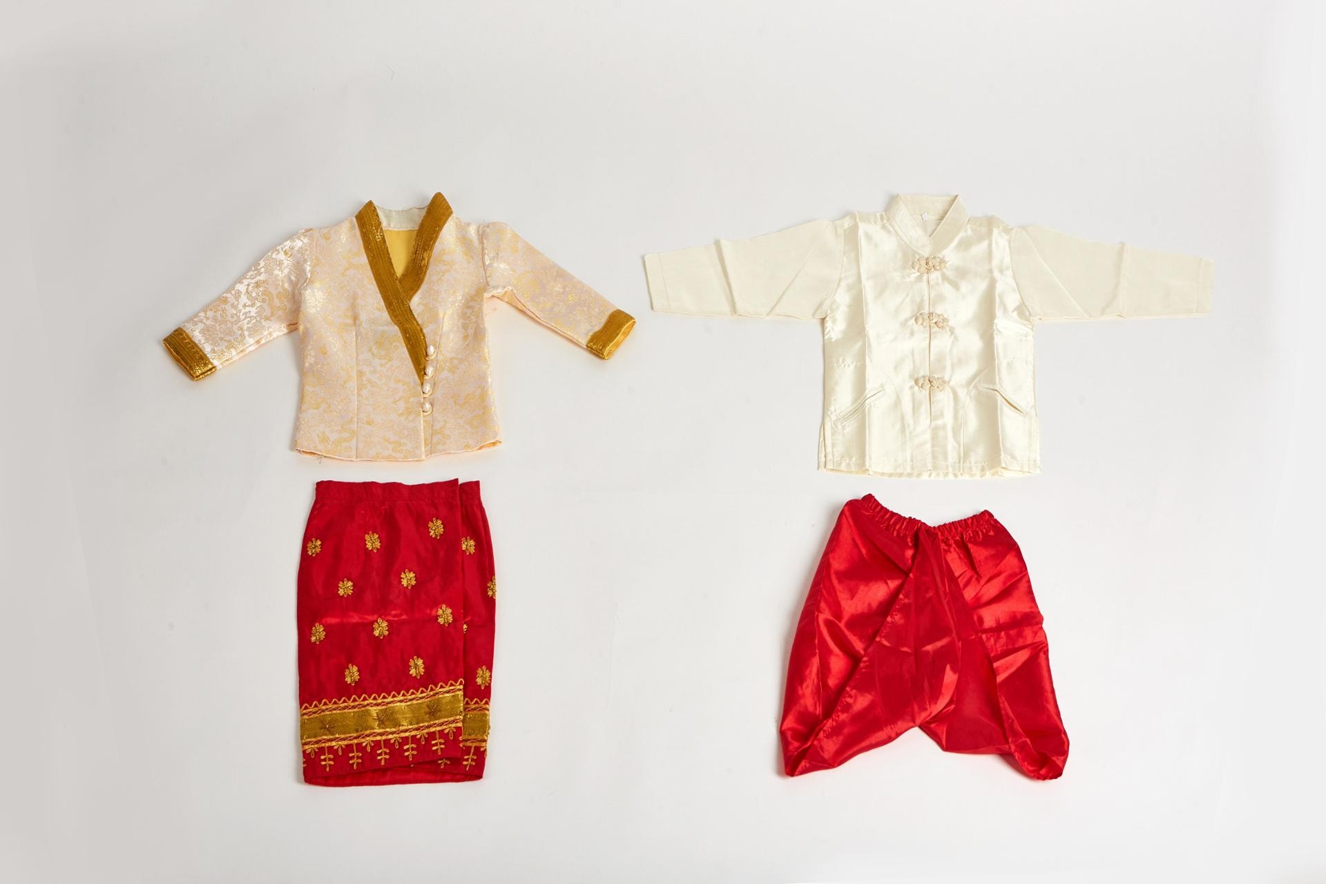 Trang phục truyền thống cho bé gái (trái) và bé trai từ lụa Lào. Ảnh: Korea Times
