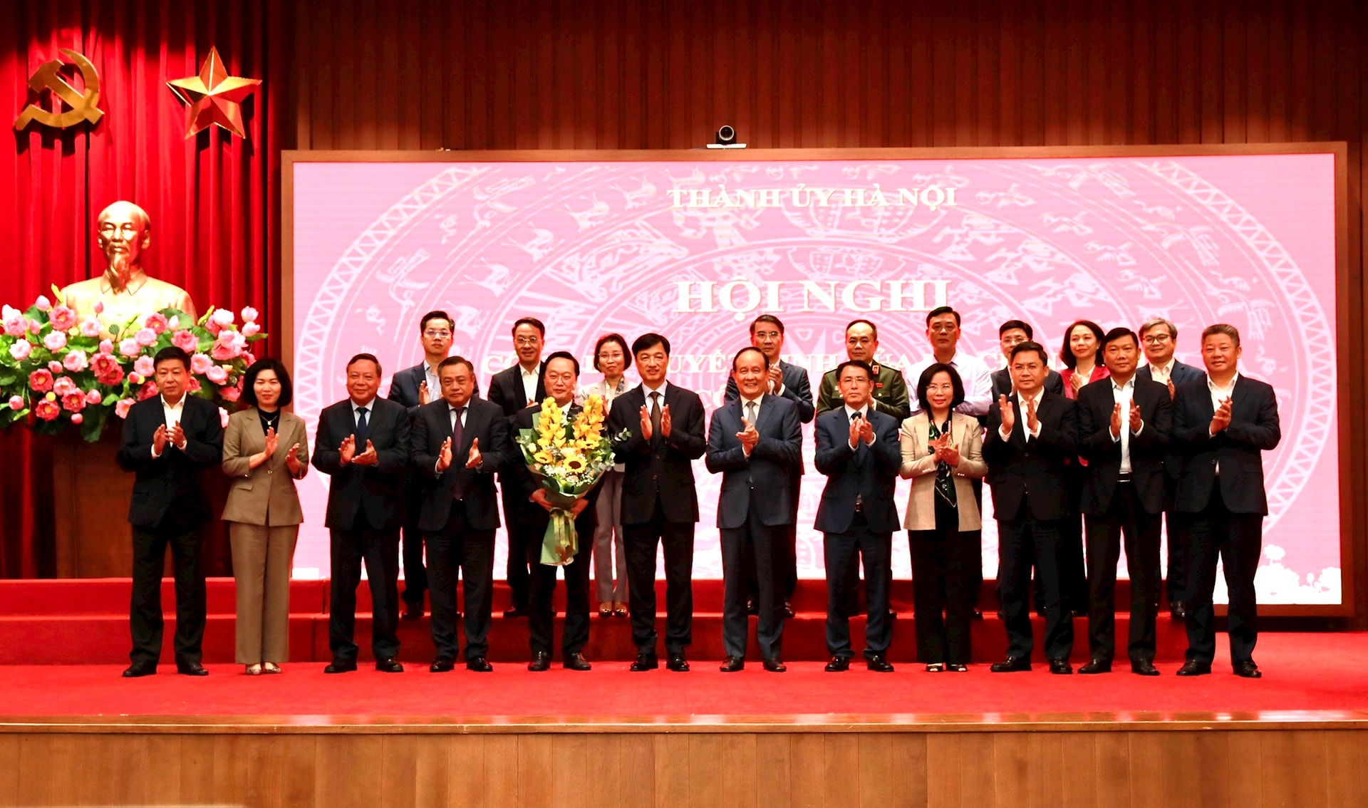 Các đồng chí lãnh đạo thành phố Hà Nội chúc mừng tân Phó Bí thư Thành ủy Hà Nội Nguyễn Đức Trung. Ảnh: Viết Thành