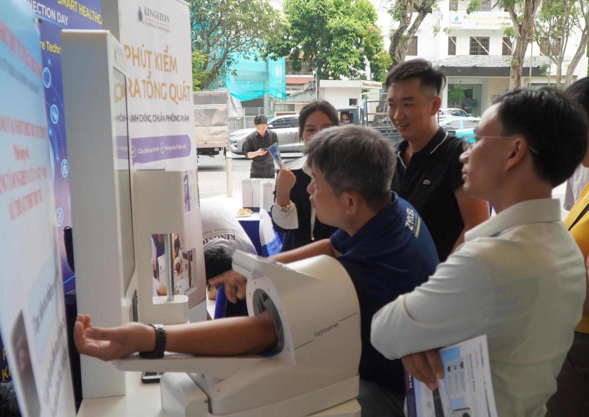 Người dân dùng thử thiết bị y tế tại triển lãm.