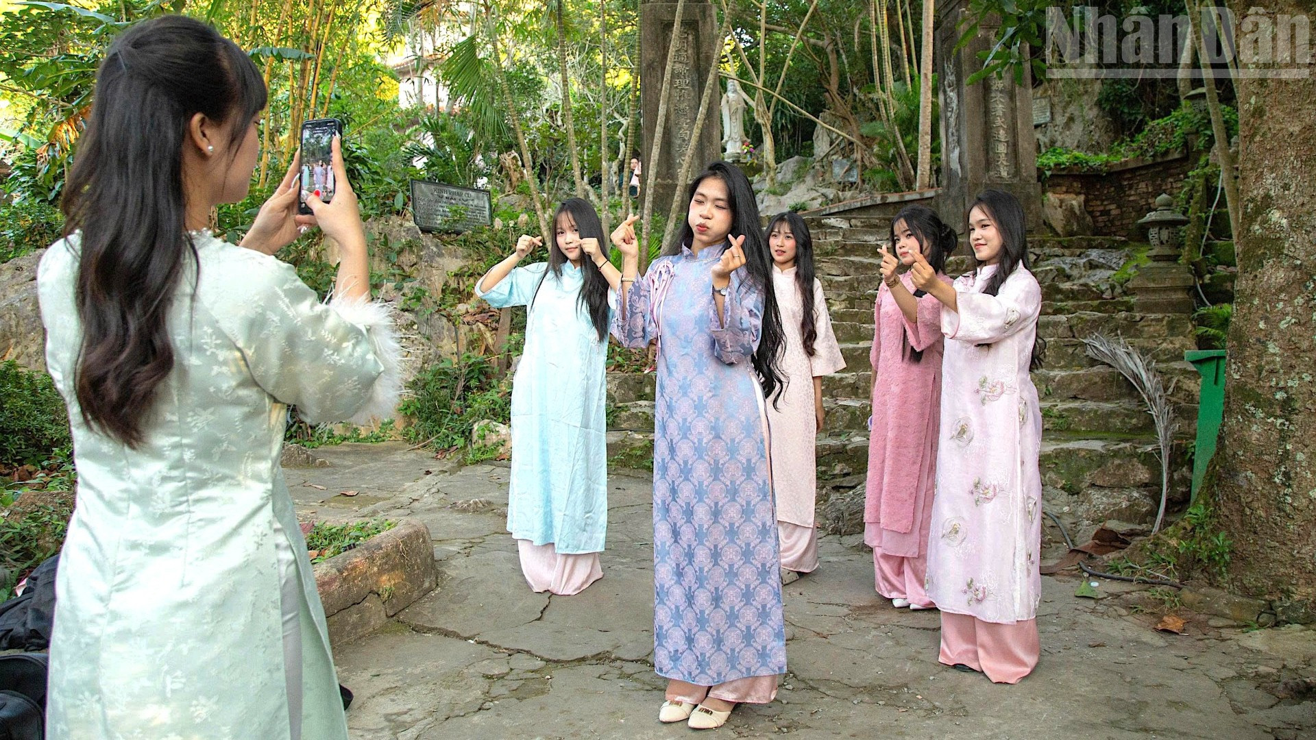 Tại Di tích quốc gia đặc biệt Danh thắng Ngũ Hành Sơn, thành phố Đà Nẵng, nhiều bạn trẻ chọn để chụp ảnh, lưu lại nhiều khoảnh khắc đẹp trước thiên nhiên cùng tà áo dài truyền thống.