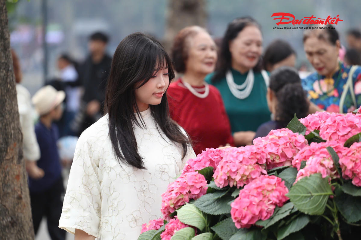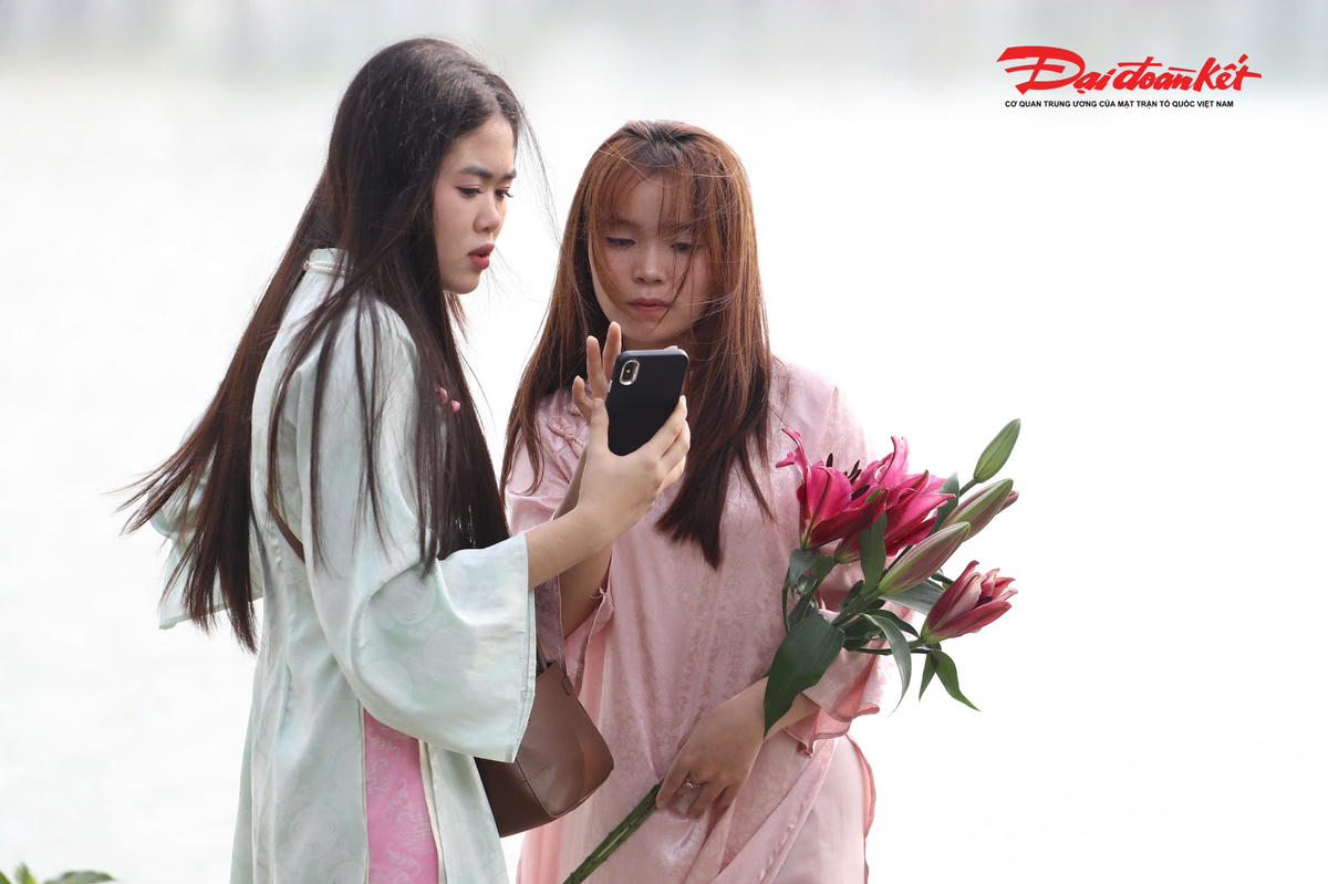 Áo dài truyền thống kết hợp cùng phụ kiện hiện đại, khăn vấn, hoa tươi hay máy ảnh đã tạo nên bức tranh giao thoa hài hòa giữa nét đẹp văn hóa truyền thống và nhịp sống trẻ trung của Thủ đô.