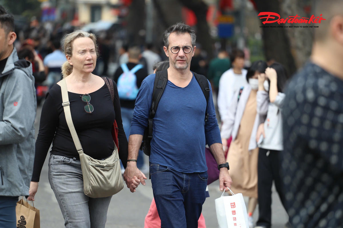 Du khách nước ngoài thư thả đi bộ trong ngày đầu năm mới.
