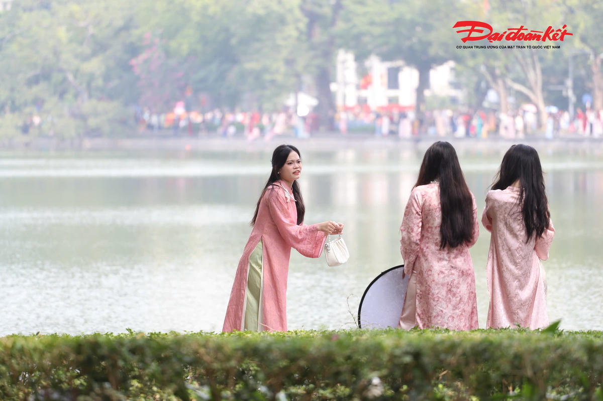 Theo ghi nhận của PV Báo Đại đoàn kết, ngày đầu năm, quanh không gian hồ Gươm, phố Đinh Tiên Hoàng, cầu Thê Húc, đền Ngọc Sơn…, dễ dàng bắt gặp hình ảnh các bạn trẻ, các nhóm bạn và gia đình trẻ khoác lên mình những tà áo dài đủ sắc màu.