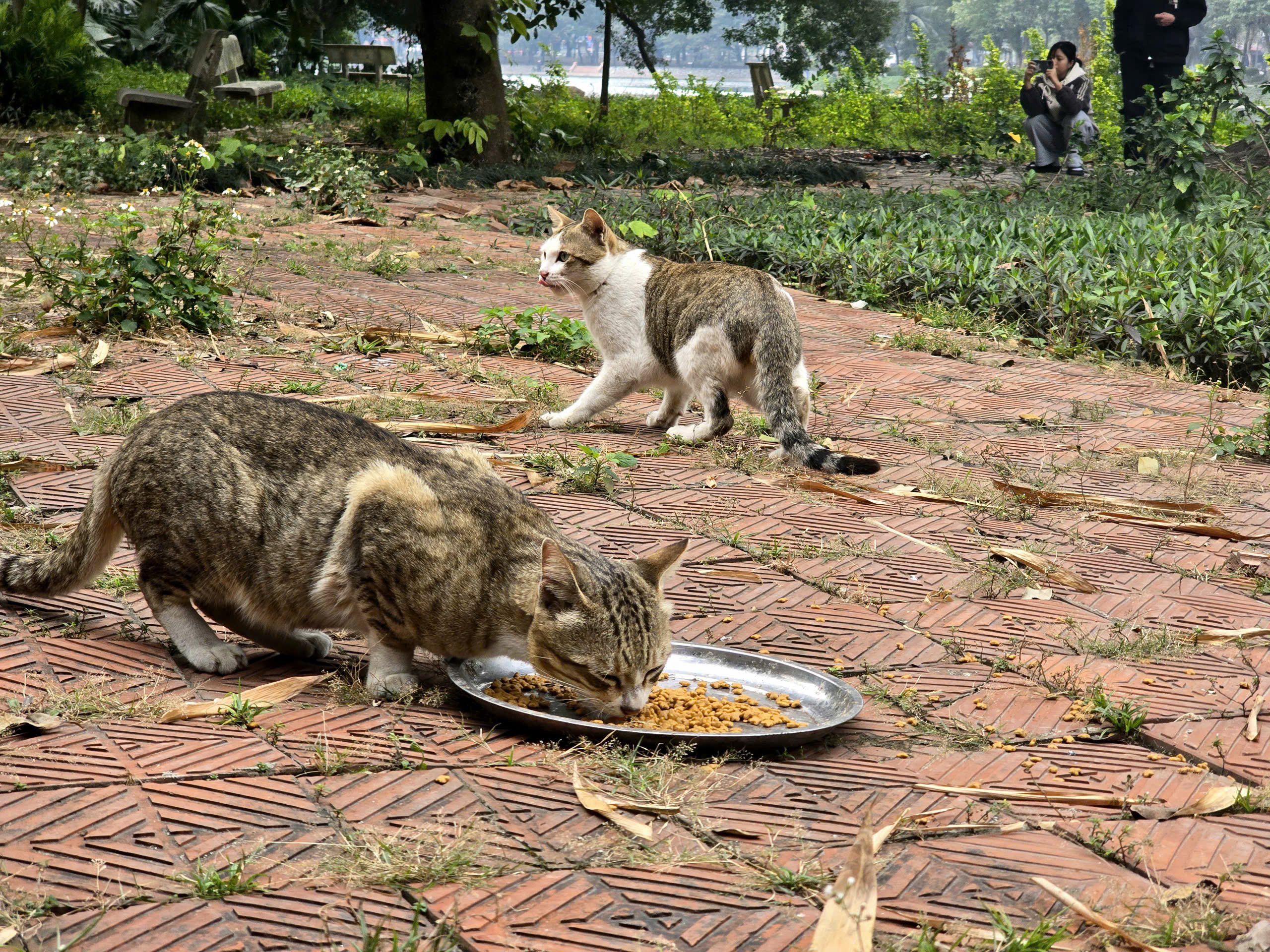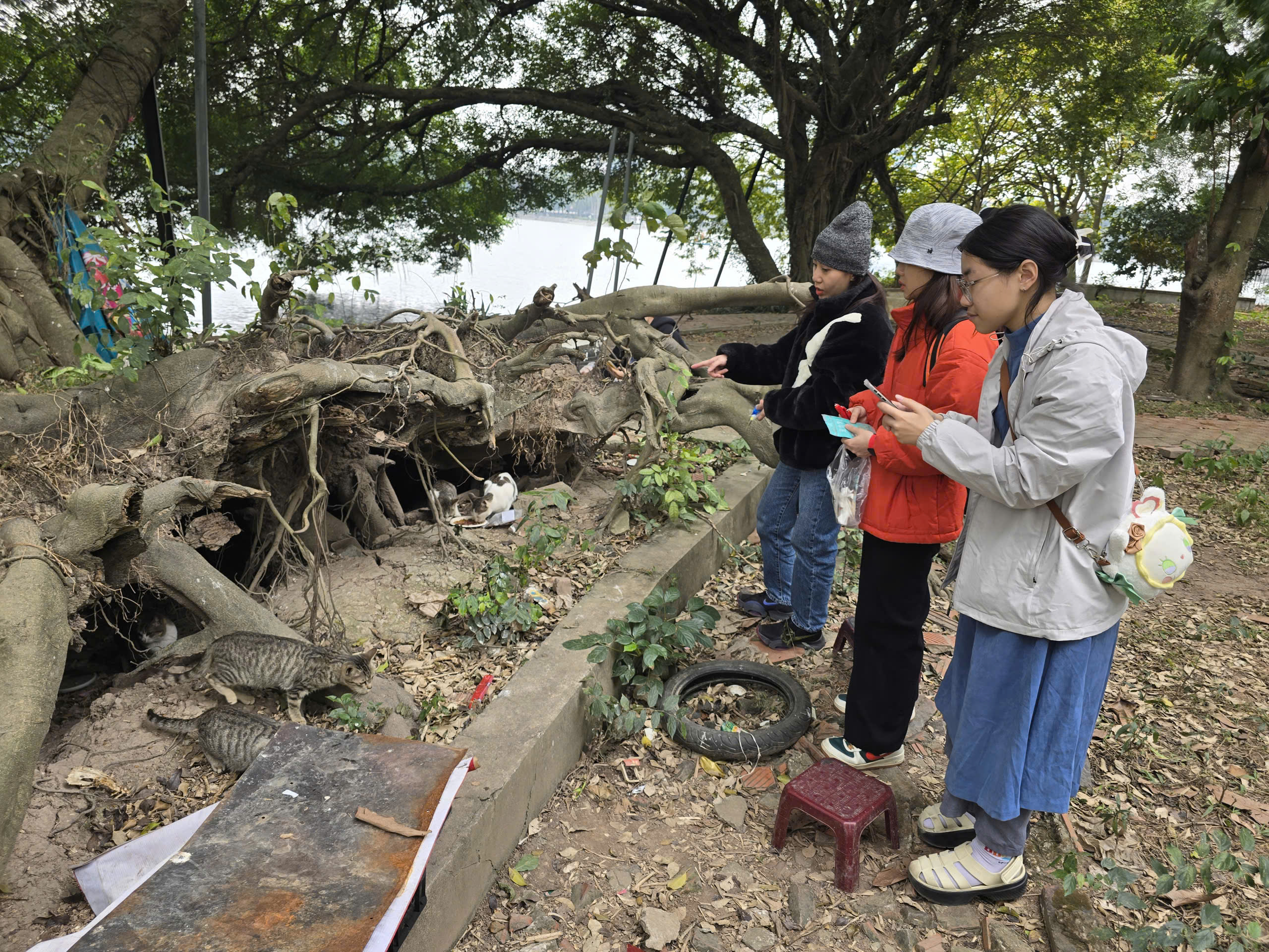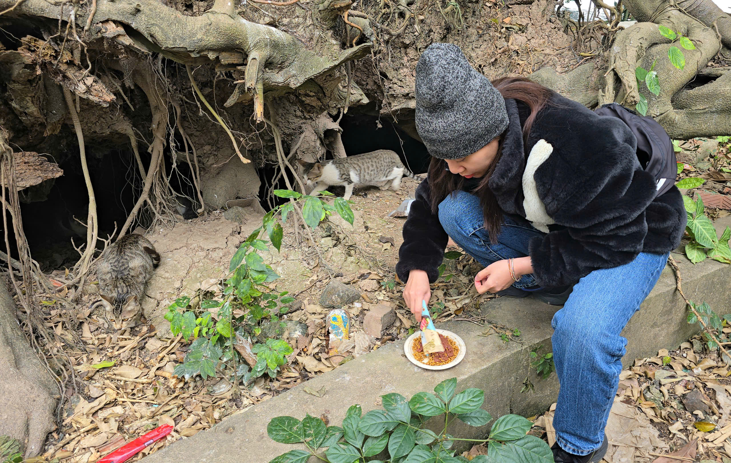 Nhiều bạn trẻ tỏ ra thích thú khi mang theo thức ăn cho mèo, quan sát đàn mèo sinh hoạt và ghi lại những khoảnh khắc đáng yêu làm kỷ niệm.